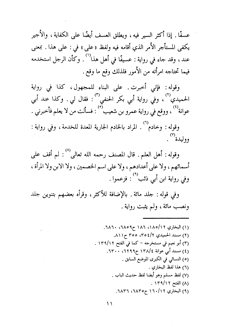 عسفًا. إذا أكثر السير فيه، ويطلق العسف أيضًا على الكفاية، والأجير يكفى المستأجر الأمر الذي أقامه فيه ولفظ "على" في: على هذا. بمعنى عند، وقد جاء في رواية: عسيفًا في أهل هذا (¬1). وكأن الرجل استخدمه فيما تحتاجه امرأته من الأمور فلذلك وقع ما وقع.