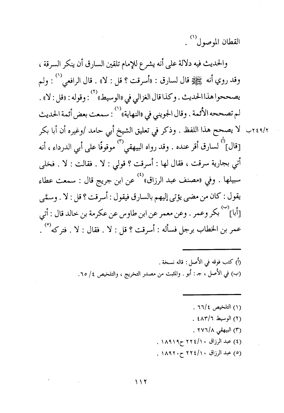 والحديث فيه دلالة على أنه يشرع للإمام تلقين السارق أن ينكر السرقة، وقد روي أنه - صلى الله عليه وسلم - قال لسارق: "أسرقت؟ قل: لا". قال الرافعي (1): ولم يصححوا هذا الحديث. وكذا قال الغزالي في "الوسيط" (¬2): وقوله: "قل: لا". لم تصححه الأئمة. وقال الجويني في "النهاية" (1): سمعت بعض أئمة الحديث لا يصحح هذا اللفظ. وذكر في تعليق الشيخ أبي حامد وغيره أن أبا بكر [قال] (أ) لسارق أقر عنده. وقد رواه البيهقي (¬3) موقوفًا على أبي الدرداء، أنه أتىِ بجارية سرقت، فقال لها: أسرقت؟ قولي: لا. فقالت: لا. فخلى سبيلها. وفي "مصنف عبد الرزاق" (¬4) عن ابن جريج قال: سمعت عطاء يقول: كان من مضى يؤتى إليهم بالسارق فيقول: أسرقت؟ قل: لا. وسمَّى [أبا] (ب) بكر وعمر. وعن معمر عن ابن طاوس عن عكرمة بن خالد قال: أتي عمر بن الخطاب برجل فسأله: أسرقت؟ قل: لا. فقال: لا. فتركه (¬5).