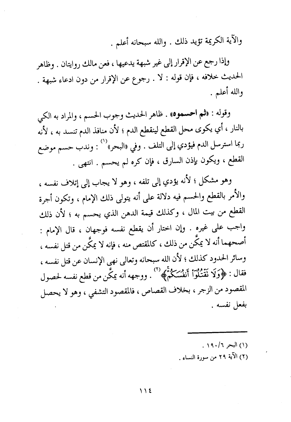 وهو مشكل، لأنه يؤدي إلى تلفه، وهو لا يجاب إلى إتلاف نفسه، والأمر بالقطع والحسم فيه دلالة على أنه يتولى ذلك الإمام، وتكون أجرة القطع من بيت المال، وكذلك قيمة الدهن الذي يحسم به؛ لأن ذلك واجب على غيره. وإن اختار أن يقطع نفسه فوجهان، قال الإمام: أصحهما أنه لا يمكَّن من ذلك، كالمقتص منه، فإنه لا يمكَّن من قتل نفسه، وسائر الحدود كذلك، لأن الله سبحانه وتعالى نهى الإنسان عن قتل نفسه، فقال: {وَلَا تَقْتُلُوا أَنْفُسَكُمْ} (¬2). ووجهه أنه يمكَّن من قطع نفسه لحصول المقصود من الزجر، بخلاف القصاص، فالمقصود التشفي، وهو لا يحصل بفعل نفسه.