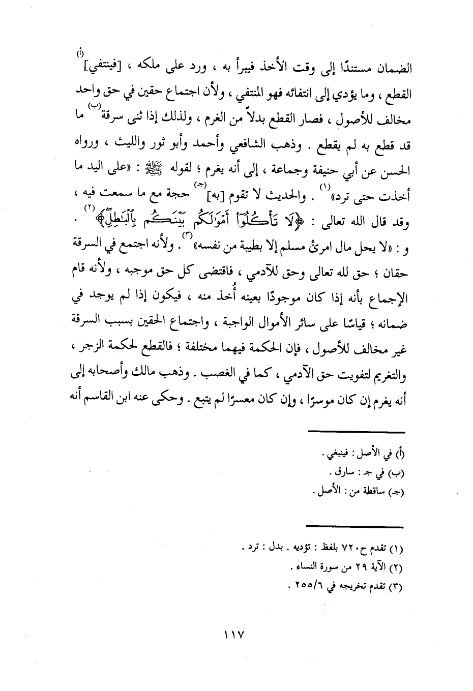 الضمان مستندًا إلى وقت الأخذ فيبرأ به، ورد على ملكه، [فينتفي] (أ) القطع، وما يؤدي إلى انتفائه فهو المنتفي، ولأن اجتماع حقين في حق واحد مخالف للأصول، فصار القطع بدلًا من الغرم، ولذلك إذا ثنى سرقة (ب) ما قد قطع به لم يقطع. وذهب الشافعي وأحمد وأبو ثور والليث، ورواه الحسن عن أبي حنيفة وجماعة، إلى أنه يغرم؛ لقوله - صلى الله عليه وسلم -: "على اليد ما أخذت حتى ترد" (¬1). والحديث لا تقوم [به] (جـ) حجة مع ما سمعت فيه، وقد قال الله تعالى: {وَلَا تَأْكُلُوا أَمْوَالَكُمْ بَيْنَكُمْ بِالْبَاطِلِ} (¬2). و: "لا يحل مال امرئ مسلم إلا بطيبة من نفسه" (¬3). ولأنه اجتمع في السرقة حقان؛ حق لله تعالى وحق للآدمي، فاقتضى كل حق موجبه، ولأنه قام الإجماع بأنه إذا كان موجودًا بعينه أُخذ منه، فيكون إذا لم يوجد في ضمانه؛ قياسًا على سائر الأموال الواجبة، واجتماع الحقين بسبب السرقة غير مخالف للأصول، فإن الحكمة فيهما مختلفة؛ فالقطع لحكمة الزجر، والتغريم لتفويت حق الآدمي، كما في الغصب. وذهب مالك وأصحابه إلى أنه يغرم إن كان موسرًا، وإن كان معسرًا لم يتبع. وحكى عنه ابن القاسم أنه