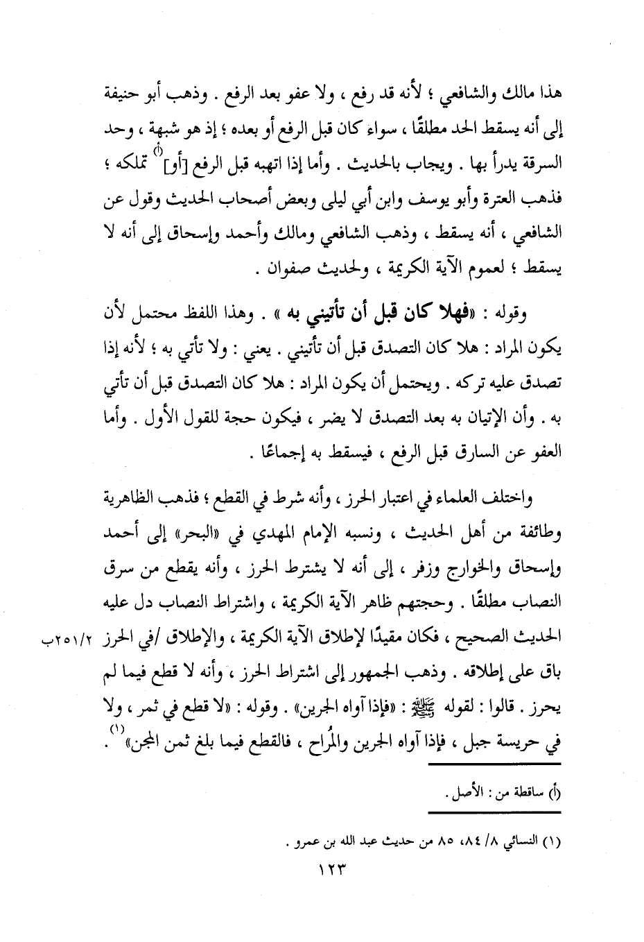 هذا مالك والشافعي؛ لأنه قد رفع، ولا عفو بعد الرفع. وذهب أبو حنيفة إلى أنه يسقط الحد مطلقًا، سواء كان قبل الرفع أو بعده؛ إذ هو شبهة، وحد السرقة يدرأ بها. ويجاب بالحديث. وأما إذا اتهبه قبل الرفع [أو] (أ) تملكه؛ فذهب العترة وأبو يوسف وابن أبي ليلى وبعض أصحاب الحديث وقول عن الشافعي، أنه يسقط، وذهب الشافعي ومالك وأحمد وإسحاق إلى أنه لا يسقط؛ لعموم الآية الكريمة، ولحديث صفوان.