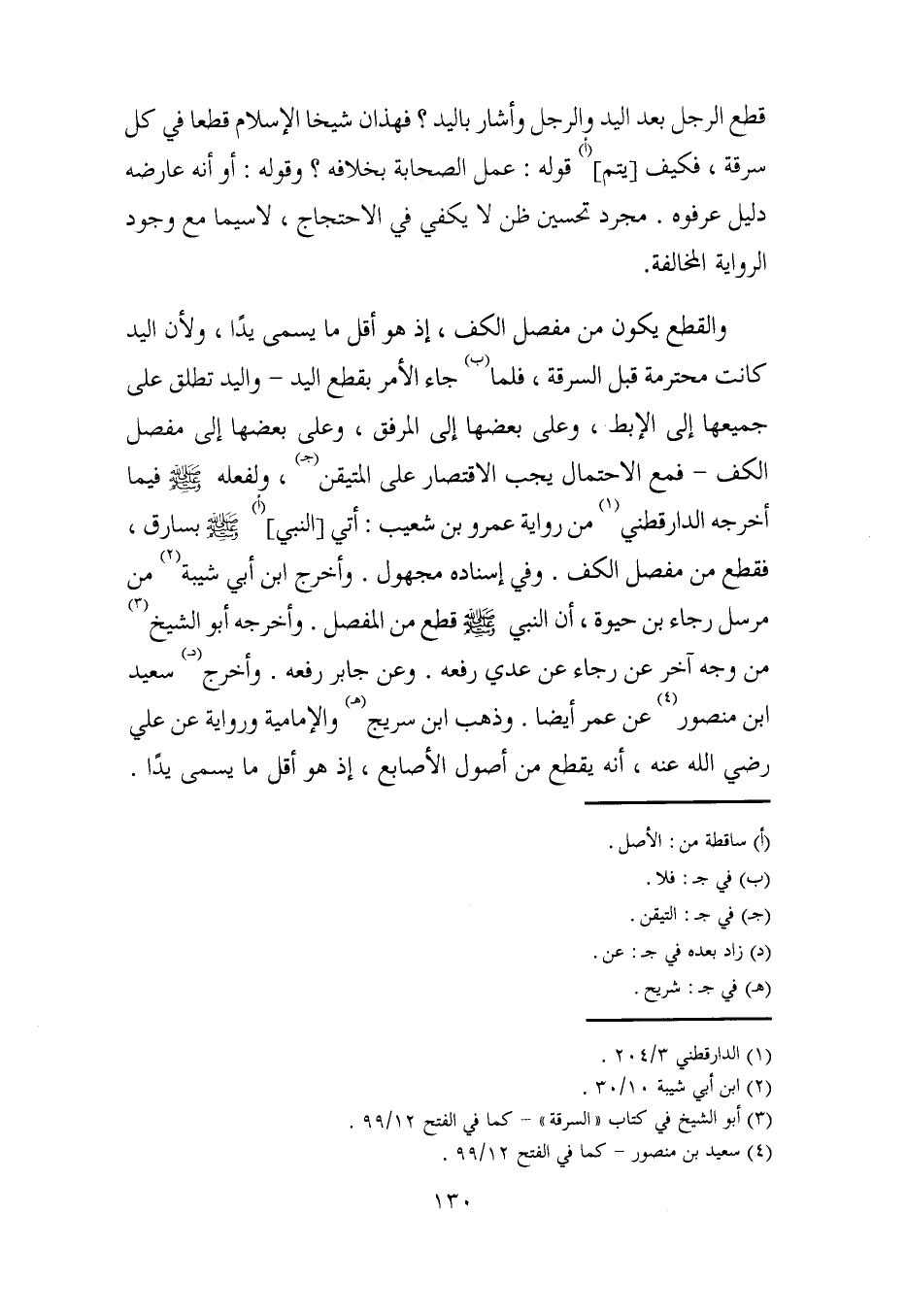 قطع الرجل بعد اليد والرجل وأشار باليد؟ فهذان شيخا الإسلام قطعا في كل سرقة، فكيف [يتم] (أ) قوله: عمل الصحابة بخلافه؟ وقوله: أو أنه عارضه دليل عرفوه. مجرد تحسين ظن لا يكفي في الاحتجاج، لا سيما مع وجود الرواية المخالفة.