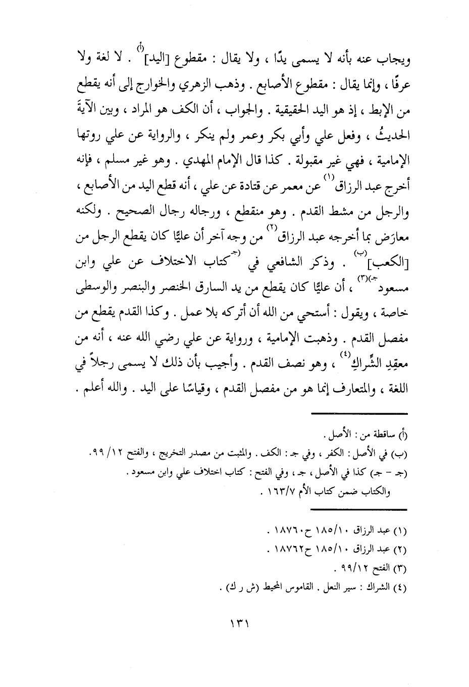 ويجاب عنه بأنه لا يسمى يدًا، ولا يقال: مقطوع [اليد] (أ). لا لغة ولا عرفًا، وإنما يقال: مقطوع الأصابع. وذهب الزهري والخوارج إلى أنه يقطع من الإبط، إذ هو اليد الحقيقية. والجواب، أن الكف هو المراد، وبين الآية الحديثُ، وفعل علي وأبي بكر وعمر ولم ينكر، والرواية عن علي روتها الإمامية، فهي غير مقبولة. كذا قال الإمام المهدي. وهو غير مسلم، فإنه أخرج عبد الرزاق (¬1) عن معمر عن قتادة عن علي، أنه قطع اليد من الأصابع، والرجل من مشط القدم. وهو منقطع، ورجاله رجال الصحيح. ولكنه معارَض بما أخرجه عبد الرزاق (¬2) من وجه آخر أن عليًّا كان يقطع الرجل من [الكعب] (ب). وذكر الشافعي في (جـ كتاب الاختلاف عن علي وابن مسعود جـ) (¬3)، أن عليًّا كان يقطع من يد السارق الخنصر والبنصر والوسطى خاصة، ويقول: أستحي من الله أن أتركه بلا عمل. وكذا القدم يقطع من مفصل القدم. وذهبت الإمامية، ورواية عن علي رضي الله عنه، أنه من معقِدِ الشِّراكِ (¬4)، وهو نصف القدم. وأجيب بأن ذلك لا يسمى رجلًا في اللغة، والمتعارف إنما هو من مفصل القدم، وقياسًا على اليد. والله أعلم.