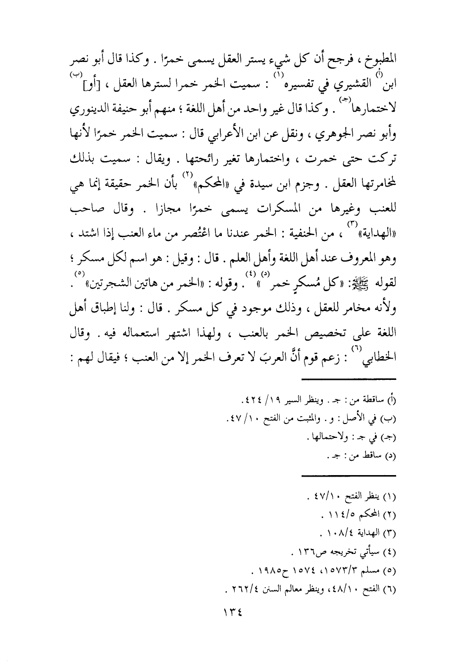 المطبوخ، فرجح أن كل شيء يستر العقل يسمى خمرًا. وكذا قال أبو نصر بن (أ) القشيري في تفسيره (¬1): سميت الخمر خمرا لسترها العقل، [أو] (ب) لاختمارها (جـ). وكذا قال غير واحد من أهل اللغة؛ منهم أبو حنيفة الدينوري وأبو نصر الجوهري، ونقل عن ابن الأعرابي قال: سميت الخمر خمرًا لأنها تركت حتى خمرت، واختمارها تغير رائحتها. ويقال: سميت بذلك لمخامرتها العقل. وجزم ابن سيدة في "المحكم" (¬2) بأن الخمر حقيقة إنما هي للعنب وغيرها من المسكرات يسمى خمرًا مجازا. وقال صاحب "الهداية" (¬3)، من الحنفية: الخمر عندنا ما اعْتُصر من ماء العنب إذا اشتد، وهو المعروف عند أهل اللغة وأهل العلم. قال: وقيل: هو اسم لكل مسكر، لقوله - صلى الله عليه وسلم -: "كل مُسكرٍ خمر (د) " (¬4). وقوله: "الخمر من هاتين الشجرتين" (¬5). ولأنه مخامر للعقل، وذلك موجود في كل مسكر. قال: ولنا إطباق أهل اللغة على تخصيص الخمر بالعنب، ولهذا اشتهر استعماله فيه. وقال الخطابي (¬6): زعم قوم أنَّ العربَ لا تعرف الخمر إلا من العنب؛ فيقال لهم: