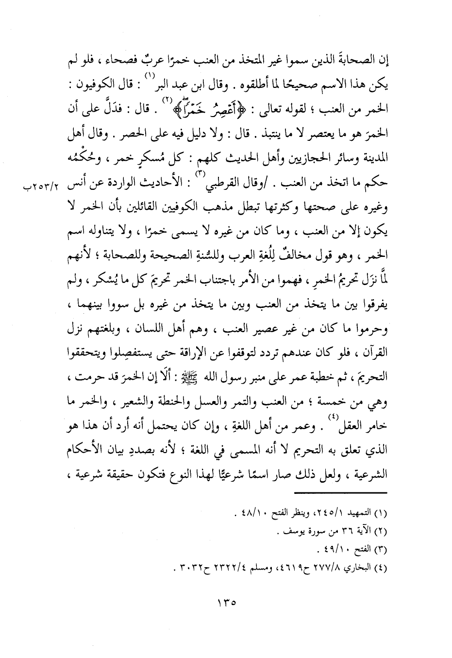 إن الصحابةَ الذين سموا غير المتخذ من العنب خمرًا عربٌ فصحاء، فلو لم يكن هذا الاسم صحيحًا لما أطلقوه. وقال ابن عبد البر (¬1): قال الكوفيون: الخمر من العنب؛ لقوله تعالى: {أَعْصِرُ خَمْرًا} (¬2). قال: فدَلَّ على أن الخمرَ هو ما يعتصر لا ما ينتبذ. قال: ولا دليل فيه على الحصر. وقال أهل المدينة وسائر الحجازيين وأهل الحديث كلهم: كل مُسكرٍ خمر، وحُكْمُه حكم ما اتخذ من العنب. وقال القرطبي (¬3): الأحاديث الواردة عن أنس وغيره على صحتها وكثرتها تبطل مذهب الكوفيين القائلين بأن الخمر لا يكون إلا من العنب، وما كان من غيره لا يسمى خمرًا، ولا يتناوله اسم الخمر، وهو قول مخالفٌ لِلُغةِ العرب وللسُّنةِ الصحيحة وللصحابة؛ لأنهم لمَّا نزَل تحريمُ الخمرِ، فهموا من الأمر باجتناب الخمر تحريمَ كل ما يُسْكر، ولم يفرقوا بين ما يتخذ من العنب وبين ما يتخذ من غيره بل سووا بينهما، وحرموا ما كان من غير عصير العنب، وهم أهل اللسان، وبلغتهم نزل القرآن، فلو كان عندهم تردد لتوقفوا عن الإراقة حتى يستفصِلوا ويتحققوا التحريمَ، ثم خطبة عمر على منبر رسول الله - صلى الله عليه وسلم -: ألَا إن الخمرَ قد حرمت، وهي من خمسة؛ من العنب والتمر والعسل والحنطة والشعير، والخمر ما خامر العقل (¬4). وعمر من أهل اللغةِ، وإن كان يحتمل أنه أرد أن هذا هو الذي تعلق به التحريم لا أنه المسمى في اللغة؛ لأنه بصددِ بيان الأحكام الشرعية، ولعل ذلك صار اسمًا شرعيًّا لهذا النوع فتكون حقيقة شرعية،