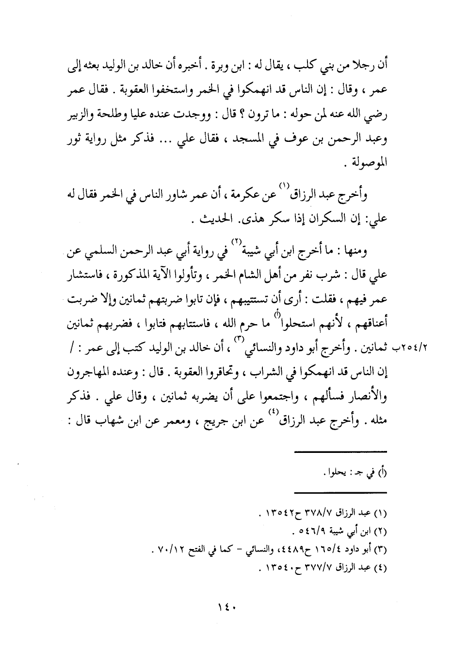 أن رجلا من بني كلب، يقال له: ابن وبرة. أخبره أن خالد بن الوليد بعثه إلى عمر، وقال: إن الناس قد انهمكوا في الخمر واستخفوا العقوبة. فقال عمر رضي الله عنه لمن حوله: ما ترون؟ قال: ووجدت عنده عليا وطلحة والزبير وعبد الرحمن بن عوف في المسجد، فقال علي ... فذكر مثل رواية ثور الموصولة.