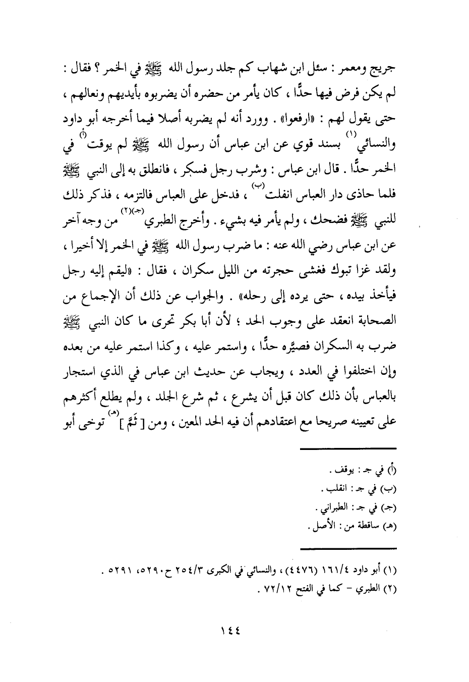 جريج ومعمر: سئل ابن شهاب كم جلد رسول الله - صلى الله عليه وسلم - في الخمر؟ فقال: لم يكن فرض فيها حدًّا، كان يأمر من حضره أن يضربوه بأيديهم ونعالهم، حتى يقول لهم: "ارفعوا". وورد أنه لم يضربه أصلا فيما أخرجه أبو داود والنسائي (¬1) بسند قوي عن ابن عباس أن رسول الله - صلى الله عليه وسلم - لم يوقت (أ) في الخمر حدًّا. قال ابن عباس: وشرب رجل فسكر، فانطلق به إلى النبي - صلى الله عليه وسلم - فلما حاذى دار العباس انفلت (ب)، فدخل على العباس فالتزمه، فذكر ذلك للنبي - صلى الله عليه وسلم - فضحك، ولم يأمر فيه بشيء. وأخرج الطبري (جـ) (¬2) من وجه آخر عن ابن عباس رضي الله عنه: ما ضرب رسول الله - صلى الله عليه وسلم - في الخمر إلا أخيرا، ولقد غزا تبوك فغشى حجرته من الليل سكران، فقال: "ليقم إليه رجل فيأخذ بيده، حتى يرده إلى رحله". والجواب عن ذلك أن الإجماع من الصحابة انعقد على وجوب الحد؛ لأن أبا بكر تحرى ما كان النبي - صلى الله عليه وسلم - ضرب به السكران فصيَّره حدًّا، واستمر عليه، وكذا استمر عليه من بعده وإن اختلفوا في العدد، ويجاب عن حديث ابن عباس في الذي استجار بالعباس بأن ذلك كان قبل أن يشرع، ثم شرع الجلد، ولم يطلع أكثرهم على تعيينه صريحا مع اعتقادهم أن فيه الحد المعين، ومن [ثَمَّ] (هـ) توخى أبو