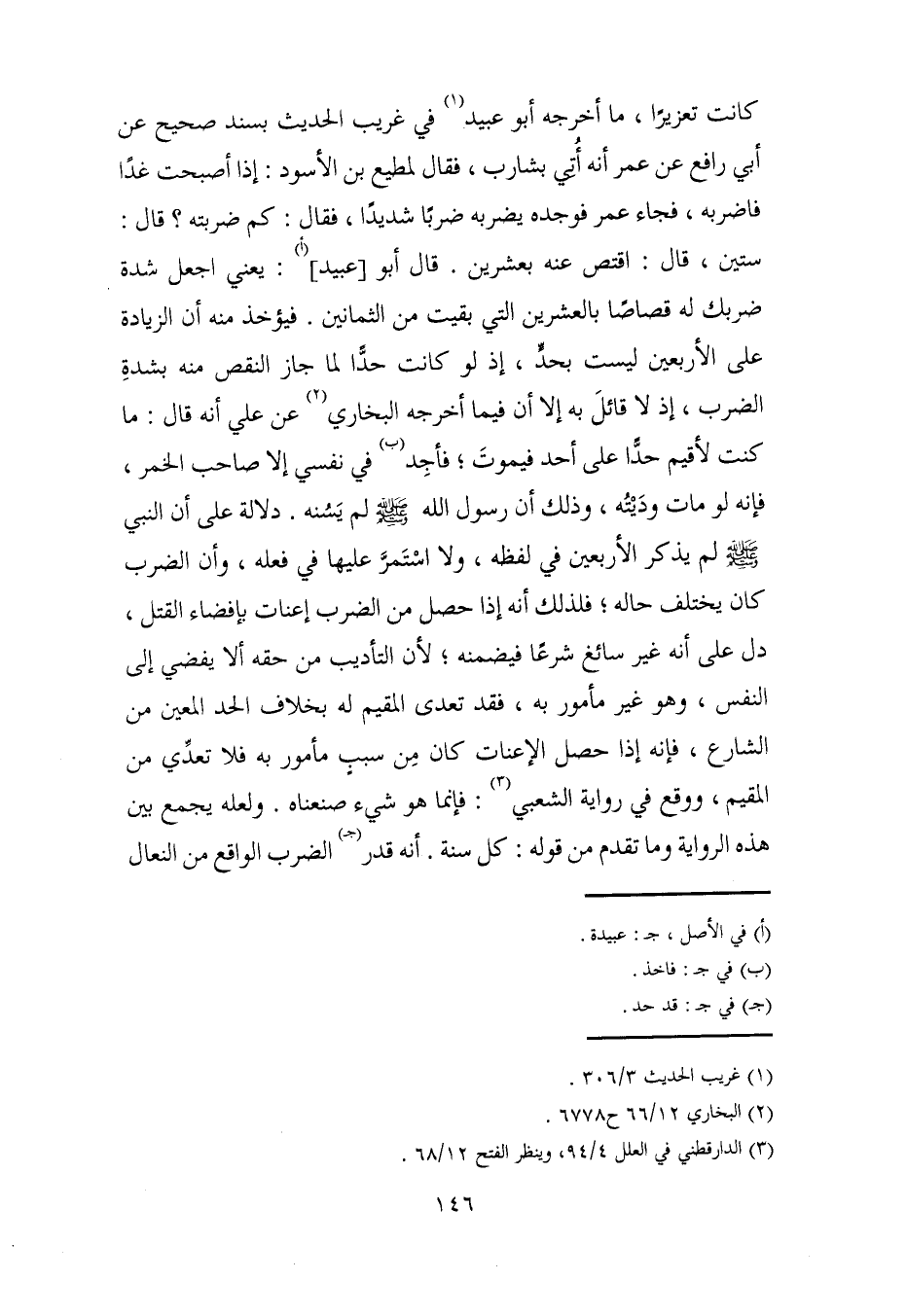 كانت تعزيرًا، ما أخرجه أبو عبيد (¬1) في غريب الحديث بسند صحيح عن أبي رافع عن عمر أنه أُتِي بشارب، فقال لمطيع بن الأسود: إذا أصبحت غدًا فاضربه، فجاء عمر فوجده يضربه ضربًا شديدًا، فقال: كم ضربته؟ قال: ستين، قال: اقتص عنه بعشرين. قال أبو [عبيد] (أ): يعني اجعل شدة ضربك له قصاصًا بالعشرين التي بقيت من الثمانين. فيؤخذ منه أن الزيادة على الأربعين ليست بحدٍّ، إذ لو كانت حدًّا لما جاز النقص منه بشدةِ الضرب، إذ لا قائلَ به إلا أن فيما أخرجه البخاري (¬2) عن علي أنه قال: ما كنت لأقيم حدًّا على أحد فيموتَ؛ فأجِد (ب) في نفسي إلا صاحب الخمر، فإنه لو مات ودَيْتُه، وذلك أدن رسول الله - صلى الله عليه وسلم - لم يَسُنه. دلالة على أن النبي - صلى الله عليه وسلم - لم يذكر الأربعين في لفظه، ولا اسْتَمرَّ عليها في فعله، وأن الضرب كان يختلف حاله؛ فلذلك أنه إذا حصل من الضرب إعنات بإفضاء القتل، دل على أنه غير سائغ شرعًا فيضمنه؛ لأن التأديب من حقه ألا يفضي إلى النفس، وهو غير مأمور به، فقد تعدى المقيم له بخلاف الحد المعين من الشارع، فإنه إذا حصل الإعنات كان مِن سببٍ مأمور به فلا تعدِّي من المقيم، ووقع في رواية الشعبي (¬3): فإنما هو شيء صنعناه. ولعله يجمع بين هذه الرواية وما تقدم من قوله: كل سنة. أنه قدر (جـ) الضرب الواقع من النعال