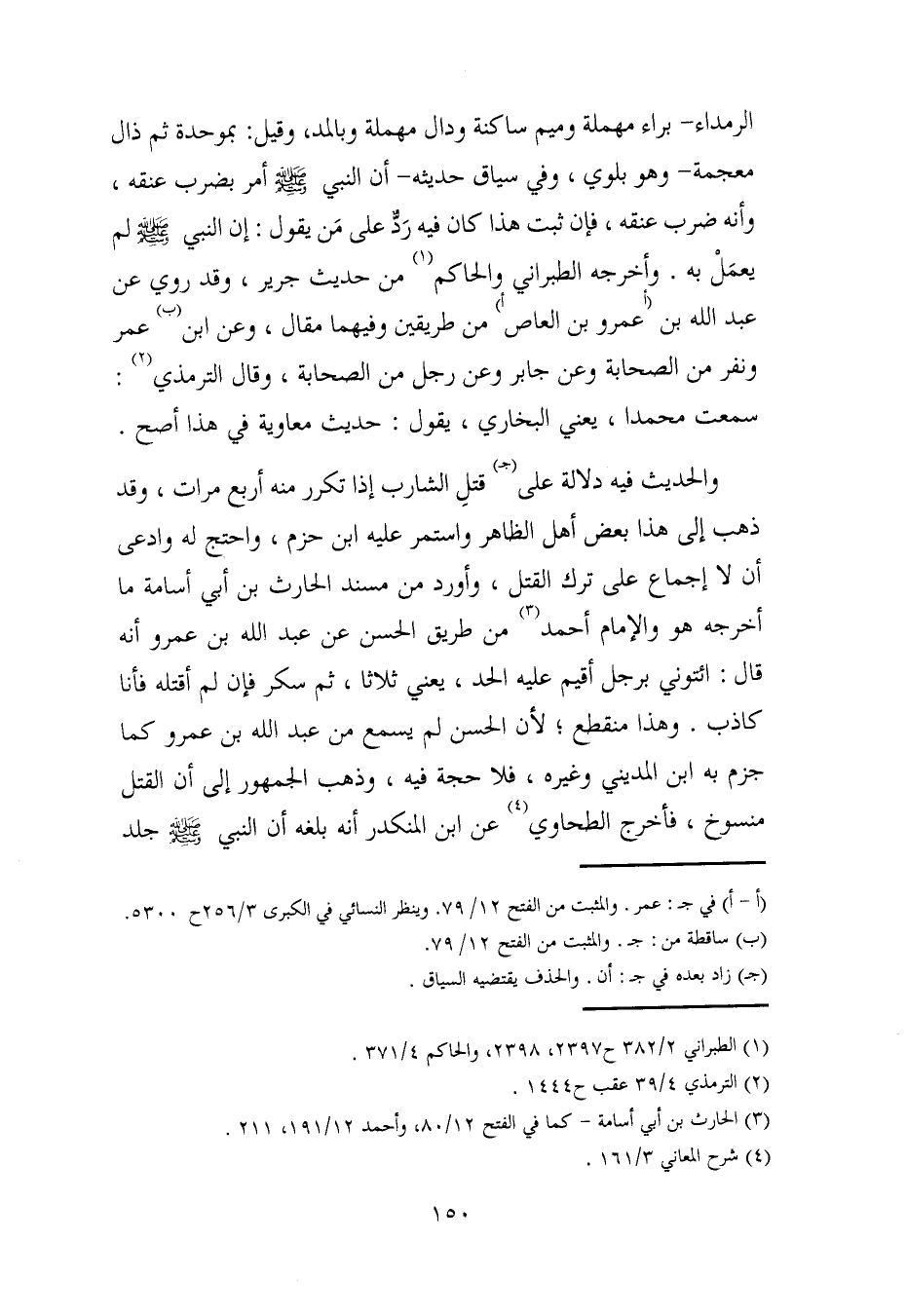 والحديث فيه دلالة على (جـ) قتلِ الشارب إذا تكرر منه أربع مرات، وقد ذهب إلى هذا بعض أهل الظاهر واستمر عليه ابن حزم، واحتج له وادعى أن لا إجماع على ترك القتل، وأورد من مسند الحارث بن أبي أسامة ما أخرجه هو والإمام أحمد (¬3) من طريق الحسن عن عبد الله بن عمرو أنه قال: ائتوني برجل أقيم عليه الحد، يعني ثلاثا، ثم سكر فإن لم أقتله فأنا كاذب. وهذا منقطع؛ لأن الحسن لم يسمع من عبد الله بن عمرو كما جزم به ابن المديني وغيره، فلا حجة فيه، وذهب الجمهور إلى أن القتل منسوخ، فأخرج الطحاوي (¬4) عن ابن المنكدر أنه بلغه أن النبي - صلى الله عليه وسلم - جلد