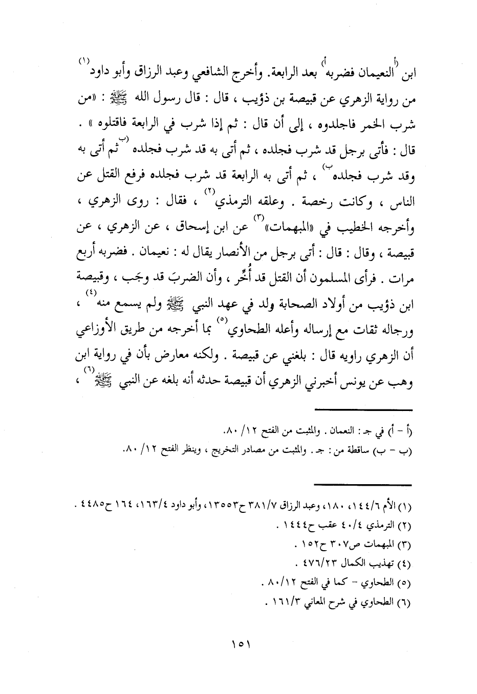 ابن (أالنعيمان فضربه أ) بعد الرابعة. وأخرج الشافعي وعبد الرزاق وأبو داود (¬1) من رواية الزهري عن قبيصة بن ذؤيب، قال: قال رسول الله - صلى الله عليه وسلم -: "من شرب الخمر فاجلدوه، إلى أن قال: ثم إذا شرب في الرابعة فاقتلوه". قال: فأتى برجل قد شرب فجلده، ثم أتى به قد شرب فجلده ب) ثم أتى به وقد شرب فجلده ب)، ثم أتى به الرابعة قد شرب فجلده فرفع القتل عن الناس، وكانت رخصة. وعلقه الترمذي (¬2)، فقال: روى الزهري، وأخرجه الخطيب في "المبهمات" (¬3) عن ابن إسحاق، عن الزهري، عن قبيصة، وقال: قال: أتى برجل من الأنصار يقال له: نعيمان. فضربه أربع مرات. فرأى المسلمون أن القتل قد أُخِّر، وأن الضربَ قد وجَب، وقبيصة بن ذؤيب من أولاد الصحابة ولد في عهد النبي - صلى الله عليه وسلم - ولم يسمع منه (¬4)، ورجاله ثقات مع إرساله وأعله الطحاوي (¬5) بما أخرجه من طريق الأوزاعي أن الزهري راويه قال: بلغني عن قبيصة. ولكنه معارض بأن في رواية ابن وهب عن يونس أخبرني الزهري أن قبيصة حدثه أنه بلغه عن النبي - صلى الله عليه وسلم - (¬6)،