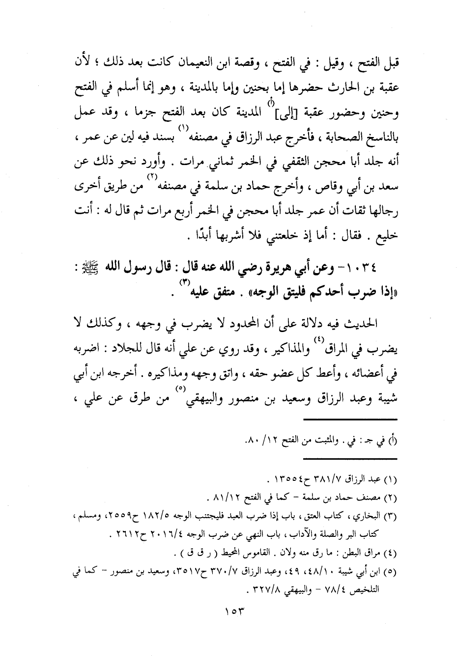 1034 - وعن أبي هريرة رضي الله عنه قال: قال رسول الله - صلى الله عليه وسلم -: "إذا ضرب أحدكم فليتق الوجه". متفق عليه (¬3).