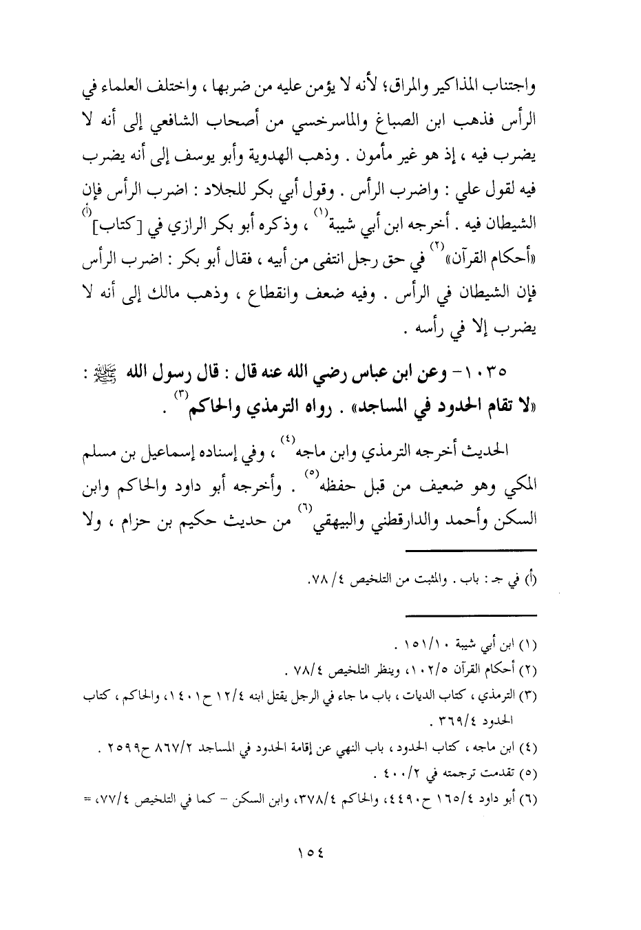 1035 - وعن ابن عباس رضي الله عنه قال: قال رسول الله - صلى الله عليه وسلم -: "لا تقام الحدود في المساجد". رواه الترمذي والحاكم (¬3).