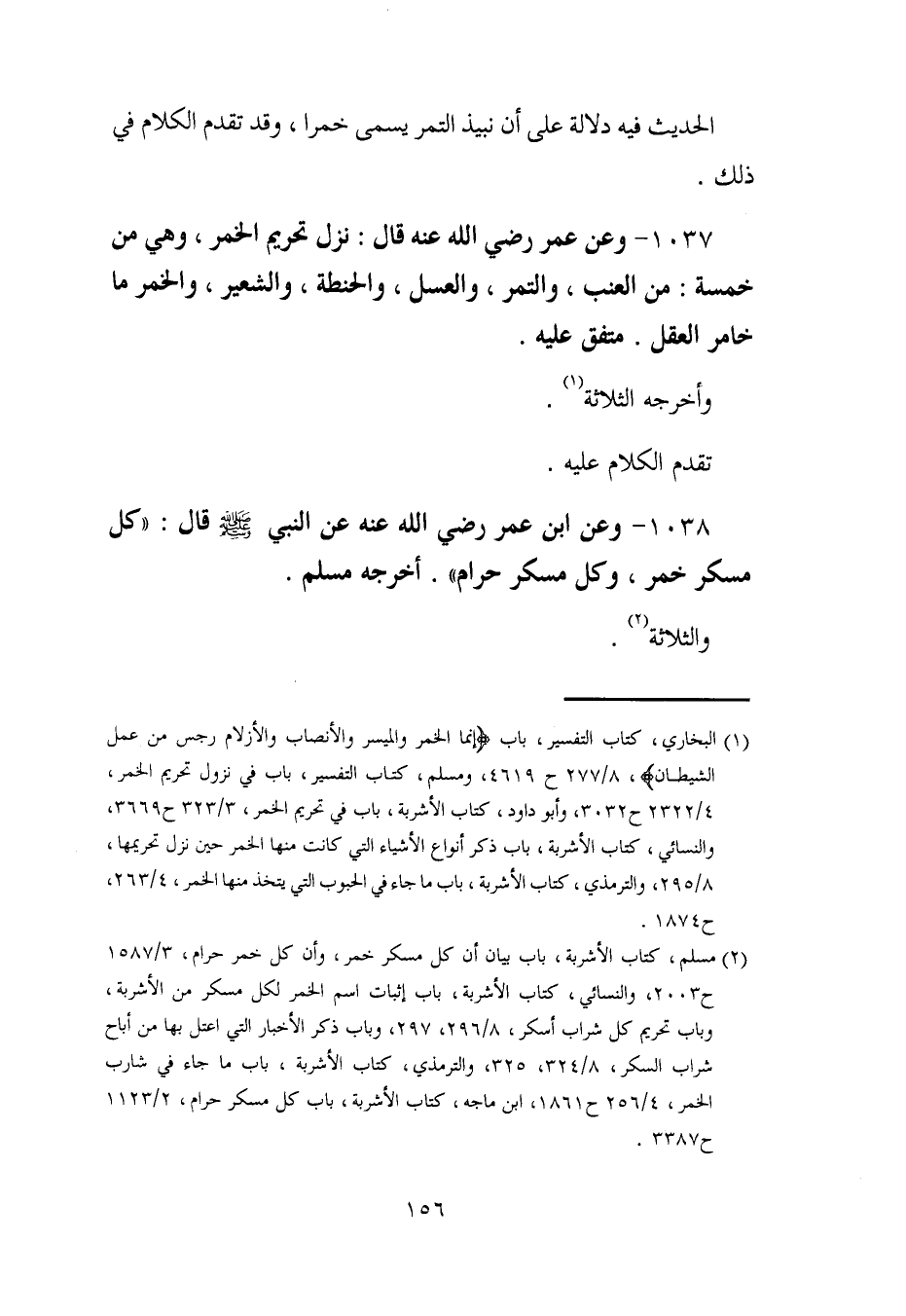 (¬2) مسلم، كتاب الأشربة، باب بيان أن كل مسكر خمر، وأن كل خمر حرام، 3/ 1587 ح 2003، والنسائي، كتاب الأشربة، باب إثبات اسم الخمر لكل مسكر من الأشربة، وباب تحريم كل شراب أسكر، 8/ 296، 297، وباب ذكر الأخبار التي اعتل بها من أباح شراب السكر، 8/ 324، 325، والترمذي، كتاب الأشربة، باب ما جاء في شارب الخمر، 4/ 256 ح 1861، ابن ماجه، كتاب الأشربة، باب كل مسكر حرام، 2/ 1123 ح 3387.