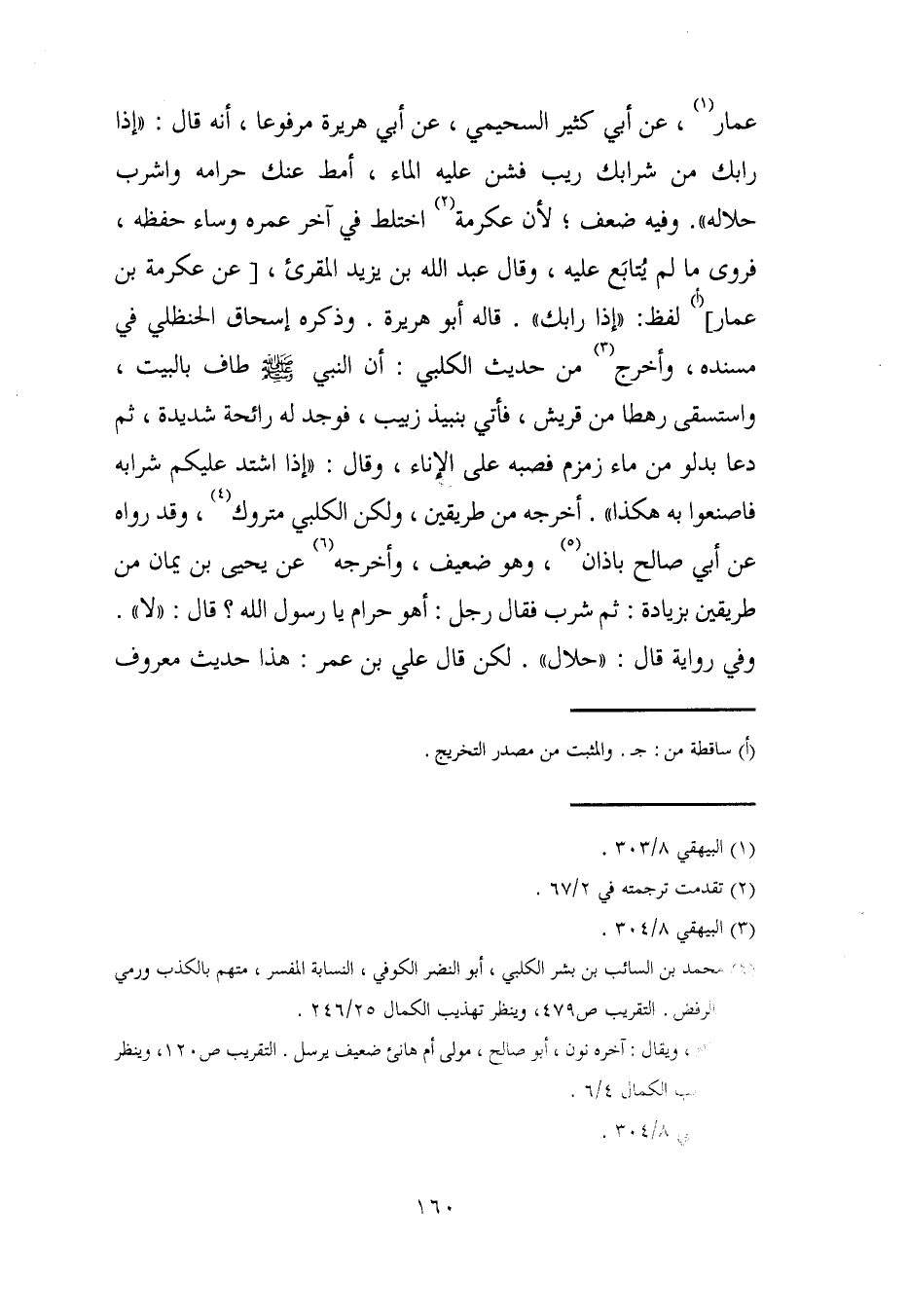 عمار (¬1)، عن أبي كثير السحيمي، عن أبي هريرة مرفوعًا، أنه قال: "إذا رابك من شرابك ريب فشن عليه الماء، أمط عنك حرامه واشرب حلاله". وفيه ضعف؛ لأن عكرمة (¬2) اختلط في آخر عمره وساء حفظه، فروى ما لم يُتابَع عليه، وقال عبد الله بن يزيد المقرئ، [عن عكرمة بن عمار] (أ) لفظ: "إذا رابك". قاله أبو هريرة. وذكره إسحاق الحنظلي في مسنده، وأخرج (¬3) من حديث الكلبي: أن النبي - صلى الله عليه وسلم - طاف بالبيت، واستسقى رهطا من قريش، فأتي بنبيذ زبيب، فوجد له رائحة شديدة، ثم دعا بدلو من ماء زمزم فصبه على الأناء، وقال: "إذا اشتد عليكم شرابه فاصنعوا به هكذا". أخرجه من طريقين، ولكن الكلبي متروك (¬4)، وقد رواه عن أبي صالح باذان (¬5)، وهو ضعيف، وأخرجه (¬6) عن يحيى بن يمان من طريقين بزيادة: ثم شرب فقال رجل: أهو حرام يا رسول الله؟ قال: "لا". وفي رواية قال: "حلال". لكن قال علي بن عمر: هذا حديث معروف