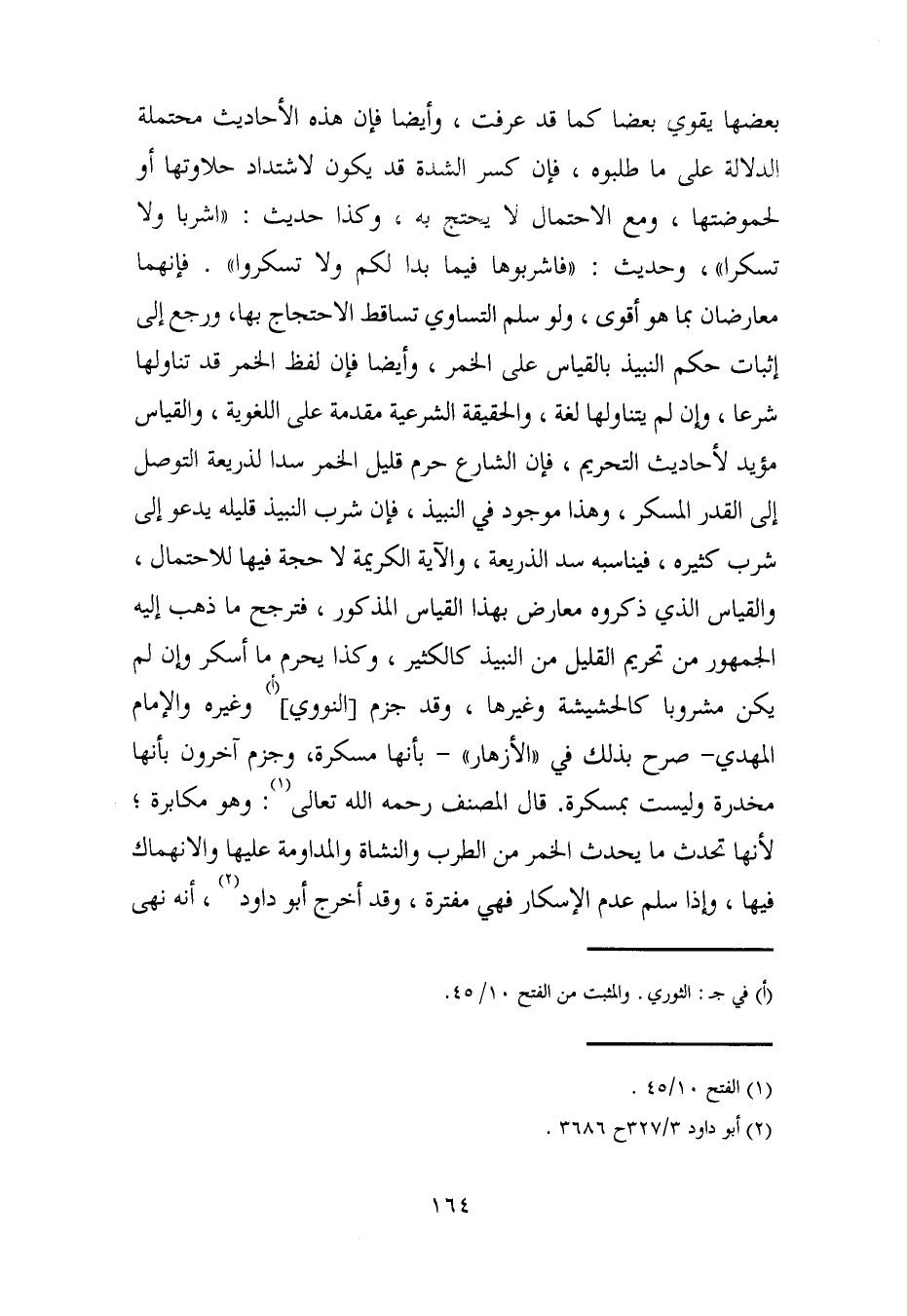 بعضها يقول بعضا كما قد عرفت، وأيضًا فإن هذه الأحاديث محتملة الدلالة على ما طلبوه، فإن كسر الشدة قد يكون لاشتداد حلاوتها أو لحموضتها، ومع الاحتمال لا يحتج به؛ وكذا حديث: "اشرلا ولا تسكرا"، وحديث: "فاشربوها فيما بدا لكم ولا تسكروا"، فإنهما معارضان بما هو أقوى، ولو سلم التساوي تساقط الاحتجاج بها، ورجع إلى إثبات حكم النبيذ بالقياس على الخمر، وأيضًا فإن لفظ الخمر قد تناولها شرعًا، وإن لم يتناولها لغة، والحقيقة الشرعية مقدمة على اللغوية، والقياس مؤيد لأحاديث التحريم، فإن الشارع حرم قليل الخمر سدا لذريعة التوصل إلى القدر المسكر، وهذا موجود في النبيذ، فإن شرب النبيذ قليله يدعو إلى شرب كثيره، فيناسبه سد الذريعة، والآية الكريمة لا حجة فيها للاحتمال، والقياس الذي ذكروه معارض بهذا القياس المذكور، فترجح ما ذهب إليه الجمهور من تحريم القليل من النبيذ كالكثير، وكذا يحرم ما أسكر وإن لم يكن مشروبا كالحشيشة وغيرها، وقد جزم [النووي] (أ) وغيره والإمام المهدي -صرح بذلك في "الأزهار"- بأنها مسكرة، وجزم آخرون بأنها مخدرة وليست بمسكرة. قال المصنف رحمه الله تعالى (¬1): وهو مكابرة؛ لأنها تحدث ما يحدث الخمر من الطرب والنشاة والمداومة عليها والانهماك فيها، وإذا سلم عدم الإسكار فهي مفترة، وقد أخرج أبو داود (¬2)، أنه نهى