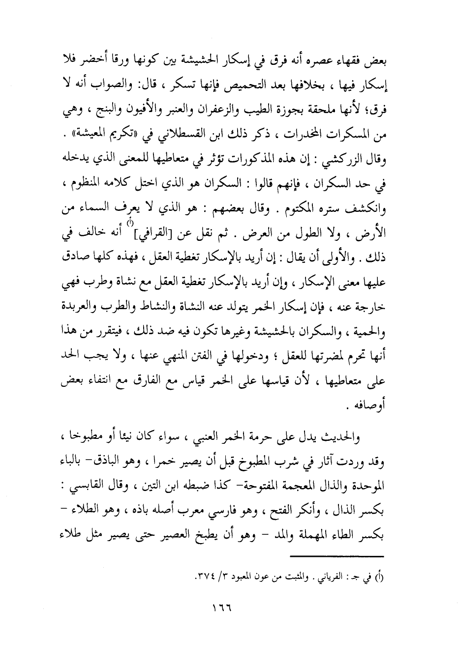 بعض فقهاء عصره أنه فرق في إسكار الحشيشة بين كونها ورقا أخضر فلا إسكار فيها، بخلافها بعد التحميص فإنها تسكر، قال: والصواب أنه لا فرق؛ لأنها ملحقة بجوزة الطب والزعفران والعنبر والأفيون والبنج، وهي من المسكرات المخدرات، ذكر ذلك ابن القسطلاني في "تكريم المعيشة". وقال الزركشي: إن هذه المذكورات تؤثر في متعاطيها للمعنى الذي يدخله في حد السكران، فإنهم قالوا: السكران هو الذي اختل كلامه المنظوم، وانكشف ستره المكتوم. وقال بعضهم: هو الذي لا يعرف السماء من الأرض، ولا الطول من العرض. ثم نقل عن [القرافي] (أ) أنه خالف في ذلك. والأولى أن يقال: إن أريد بالإسكار تغطية العقل، فهذه كلها صادق عليها معنى الإسكار، وإن أريد بالإسكار تغطية العقل مع نشاة وطرب فهي خارجة عنه، فإن إسكار الخمر يتولد عنه النشاة والنشاط والطرب والعربدة والحمية، والسكران بالحشيشة وغيرها تكون فيه ضد ذلك، فيتقرر من هذا أنها تحرم لمضرتها للعقل، ودخولها في الفتن المنهي عنها, ولا يجب الحد على متعاطيها؛ لأن قياسها على الخمر قياس مع الفارق مع انتفاء بعض أوصافه.