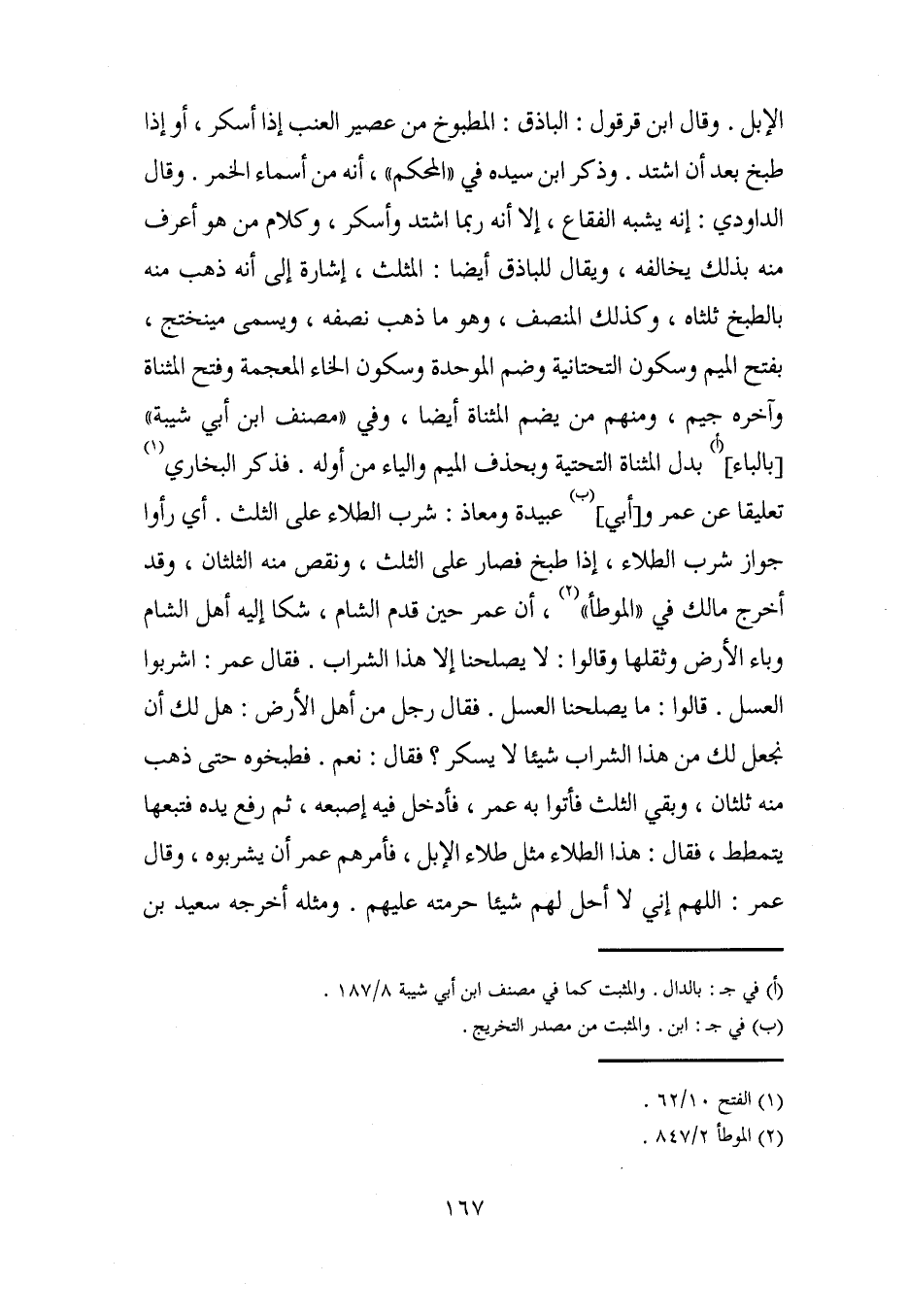 الإبل. وقال ابن قرقول: الباذق: المطبوخ من عصير العنب إذا أسكر، أو إذا طبخ بعد أن اشتد. وذكر ابن سيده في "المحكم"، أنه من أسماء الخمر. وقال الداودي: إنه يشبه الفقاع، إلا أنه ربما اشتد وأسكر، وكلام من هو أعرف منه بذلك يخالفه، ويقال للباذق أيضًا: المثلث، إشارة إلى أنه ذهب منه بالطبخ ثلثاه، وكذلك المنصف، وهو ما ذهب نصفه، ويسمى مينختج، بفتح الميم وسكون التحتانية وضم الموحدة وسكون الخاء المعجمة وفتح المثناة وآخره جيم، ومنهم من يضم المثناة أيضًا، وفي "مصنف ابن أبي شيبة" [بالباء] (أ) بدل المثناة التحتية وبحذف الميم والياء من أوله. فذكر البخاري (¬1) تعليقا عن عمر و [أبي] (5) عبيدة ومعاذ: شرب الطلاء على الثلث. أي رأوا جواز شرب الطلاء، إذا طبخ فصار على الثلث، ونقص منه الثلثان، وقد أخرج مالك في "الموطأ" (¬2)، أن عمر حين قدم الشام، شكا إليه أهل الشام وجاء الأرض وثقلها وقالوا: لا يصلحنا إلا هذا الشراب. فقال عمر: اشربوا العسل. قالوا: ما يصلحنا العسل. فقال رجل من أهل الأرض: هل لك أن نجعل لك من هذا الشراب شيئًا لا يسكر؟ فقال: نعم. فطبخوه حتى ذهب منه ثلثان، وبقي الثلث فأتوا به عمر، فأدخل فيه إصبعه، ثم رفع يده فتبعها يتمطط، فقال: هذا الطلاء مثل طلاء الإبل، فأمرهم عمر أن يشربوه، وقال عمر: اللهم إني لا أحل لهم شيئًا حرمته عليهم. ومثله أخرجه سعيد بن