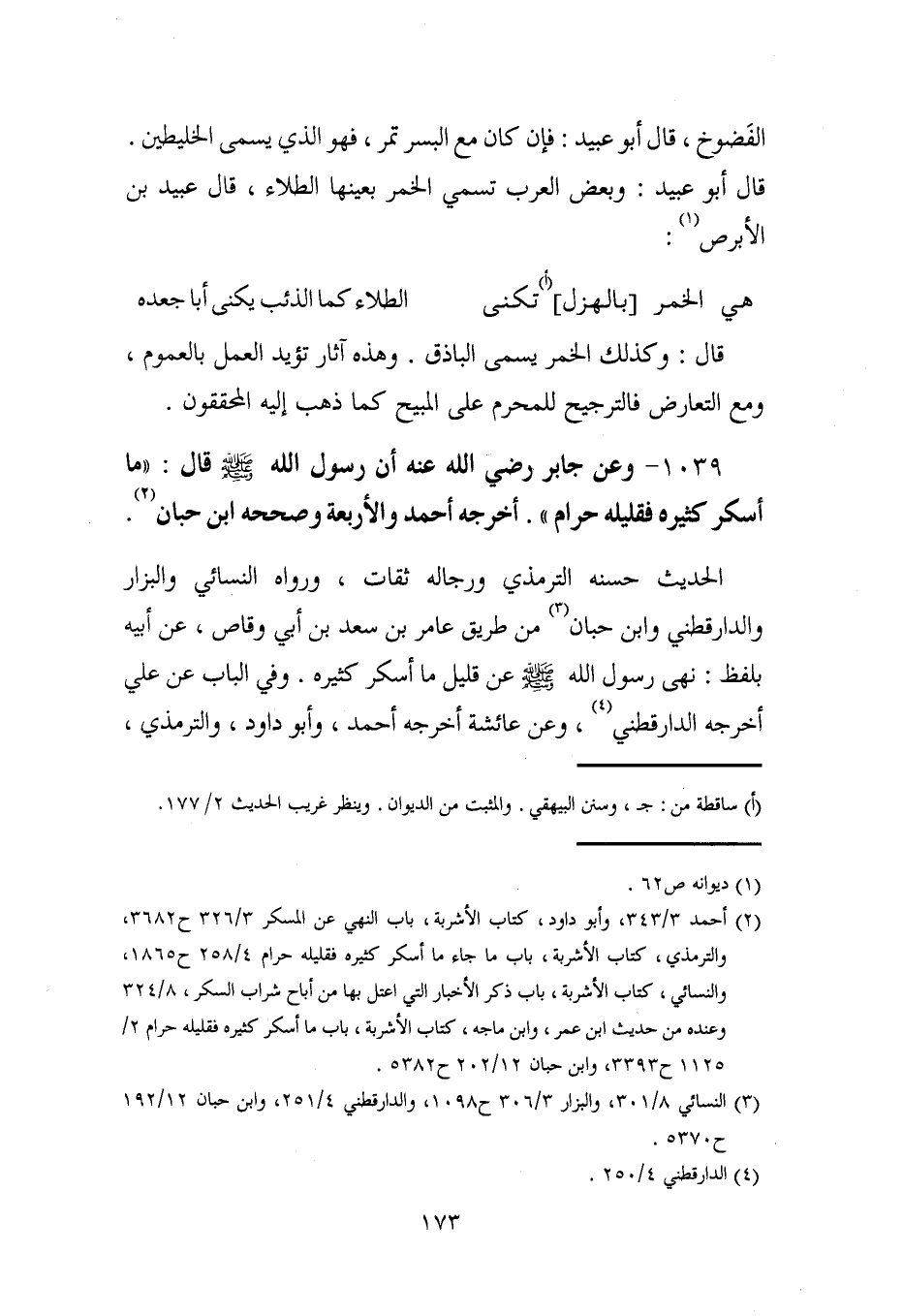 1039 - وعن جابر رضي الله عنه أن رسول الله - صلى الله عليه وسلم - قال: "ما أسكر كثيره فقليله حرام". أخرجه أحمد والأربعة وصححه ابن حبان (¬2).