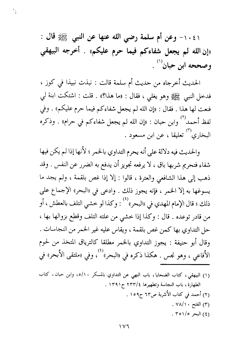 1041 - وعن أم سلمة رضي الله عنها عن النبي - صلى الله عليه وسلم - قال: "إن الله لم يجعل شفاءكم فيما حرم عليكم". أخرجه البيهقي وصححه ابن حبان (¬1).