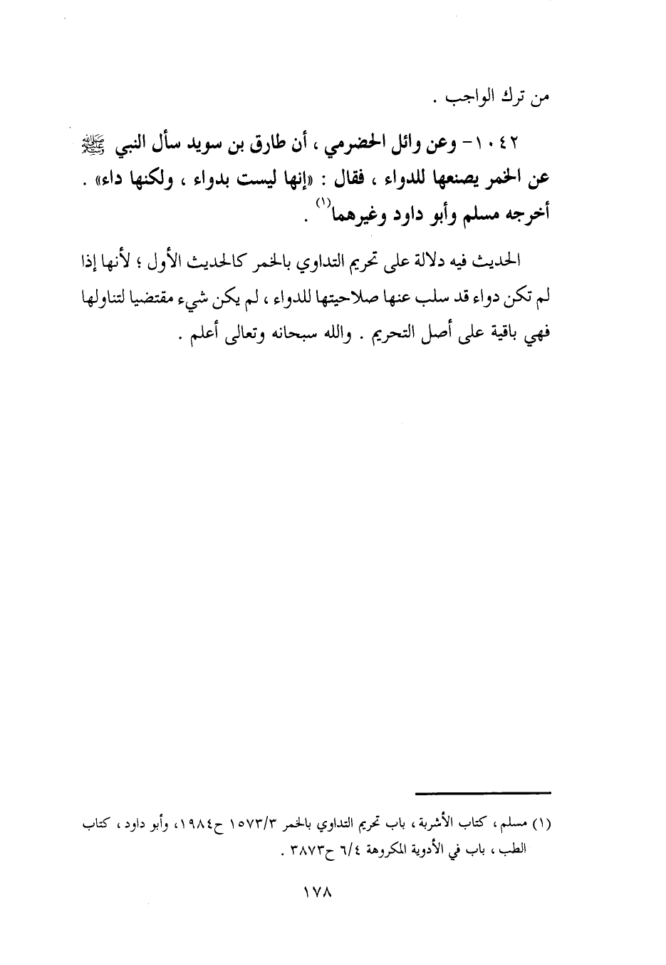 1042 - وعن وائل الحضرمي، أن طارق بن سويد سأل النبي - صلى الله عليه وسلم - عن الخمر يصنعها للدواء، فقال: "إنها ليست بدواء، ولكنها داء". أخرجه مسلم وأبو داود وغيرهما (¬1).