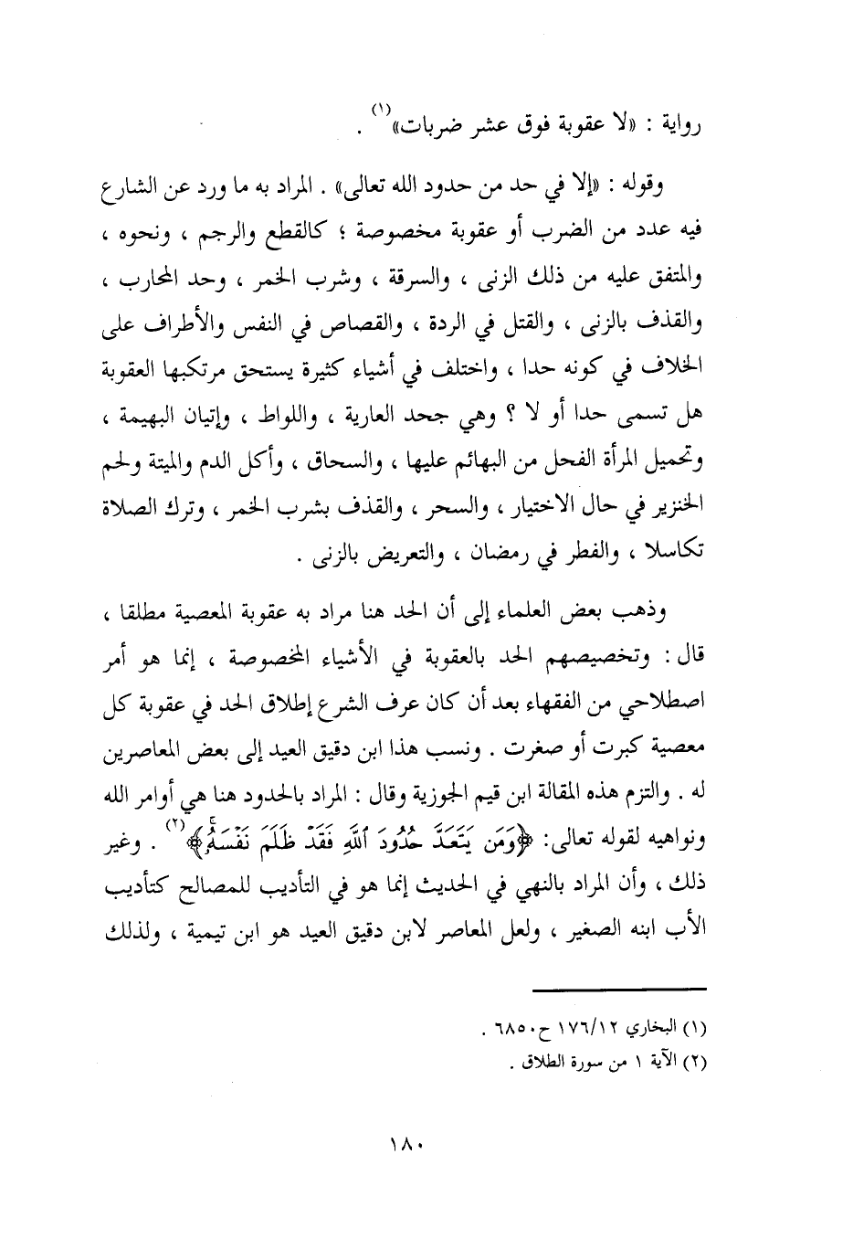 وذهب بعض العلماء إلى أن الحد هنا مراد به عقوبة المعصية مطلقا، قال: وتخصيصهم الحد بالعقوبة في الأشياء المخصوصة، إنما هو أمر اصطلاحي من الفقهاء بعد أن كان عرف الشرع إطلاق الحد في عقوبة كل معصية كبرت أو صغرت. ونسب هذا ابن دقيق العيد إلى بعض المعاصرين له. والتزم هذه المقالة ابن قيم الجوزية وقال: المراد بالحدود هنا هي أوامر الله ونواهيه لقوله تعالى: {وَمَنْ يَتَعَدَّ حُدُودَ اللَّهِ فَقَدْ ظَلَمَ نَفْسَهُ} (¬2). وغير ذلك، وأن المراد بالنهي في الحديث إنما هو في التأديب للمصالح كتأديب الأب ابنه الصغير, ولعل المعاصر لابن دقيق العيد هو ابن تيمية، ولذلك