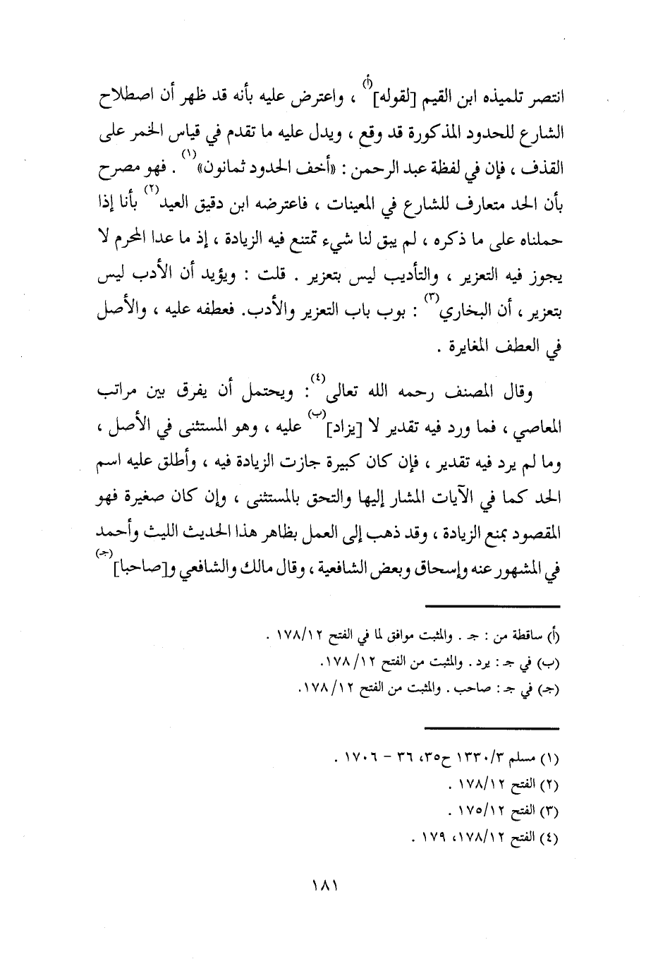 وقال المصنف رحمه الله تعالى (¬4): ويحتمل أن يفرق بين مراتب المعاصي، فما ورد فيه تقدير لا [يزاد] (ب) عليه، وهو المستثنى في الأصل، وما لم يرد فيه تقدير، فإن كان كبيرة جازت الزيادة فيه، وأطلق عليه اسم الحد كما في الآيات المشار إليها والتحق بالمستثنى، وإن كان صغيرة فهو المقصود بمنع الزيادة، وقد ذهب إلى العمل بظاهر هذا الحديث الليث وأحمد في المشهور عنه وإسحاق وبعض الشافعية، وقال مالك والشافعي و [صاحبا] (جـ)