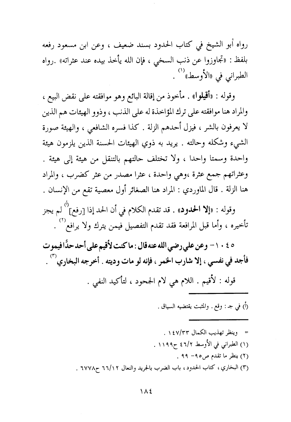 رواه أبو الشيخ في كتاب الحدود بسند ضعيف، وعن ابن مسعود رفعه بلفظ: "تجاوزوا عن ذنب السخي، فإن الله يأخذ بيده عند عثراته". رواه الطبراني في "الأوسط" (¬1).
