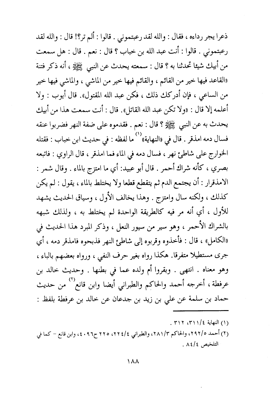 ذعرا يجر رداءه، فقال: والله لقد رعبتموني. قالوا: ألم تر؟! قال: والله لقد رعبتموني. قالوا: أنت عبد الله بن خباب؟ قال: نعم. قال: هل سمعت من أبيك شيئًا تحدثنا به؟ قال: سمعته يحدث عن النبي - صلى الله عليه وسلم -، أنه ذكر فتنة "القاعد فيها خير من القائم، والقائم فيها خير من الماشي، والماشي فيها خير من الساعي، فإن أدركك ذلك، فكن عبد الله المقتول". قال أيوب: ولا أعلمه إلا قال: "ولا تكن عبد الله القاتل". قال: أنت سمعت هذا من أبيك يحدث به عن النبي - صلى الله عليه وسلم -؟ قال: نعم. فقدموه على ضفة النهر فضربوا عنقه فسأل دمه امذقر. قال في "النهاية" (¬1) ما لفظه: في حديث ابن خباب: فقتله الخوارج على شاطئ نهر، فسال دمه في الماء فما امذقر، قال الراوي: فأتبعه بصري، كأنه شراك أحمر. قال أبو عبيد: أي ما امتزج بالماء. وقال شمر: الامذقرار: أن يجتمع الدم ثم يتقطع قطعا ولا يختلط بالماء، يقول: لم يكن كذلك، ولكنه سال وامتزج. وهذا يخالف الأول، وسياق الحديث يشهد للأول، أي أنه مر فيه كالطريقة الواحدة لم يختلط به، ولذلك شبهه بالشراك الأحمر، وهو سير من سيور النعل، وذكر المبرد هذا الحديث في "الكامل"، قال: فأخذوه وقربوه إلى شاطئ النهر فذبحوه فامذقر دمه، أي جرى مستطيلا متفرقا. هكذا رواه بغير حرف النفي، ورواه بعضهم بالباء، وهو معناه. انتهى. وبقروا أم ولده عما في بطنها. وحديث خالد بن عرفطة، أخرجه أحمد والحاكم والطبراني أيضًا وابن قانع (¬2) من حديث حماد بن سلمة عن علي بن زيد بن جدعان عن خالد بن عرفطة بلفظ: