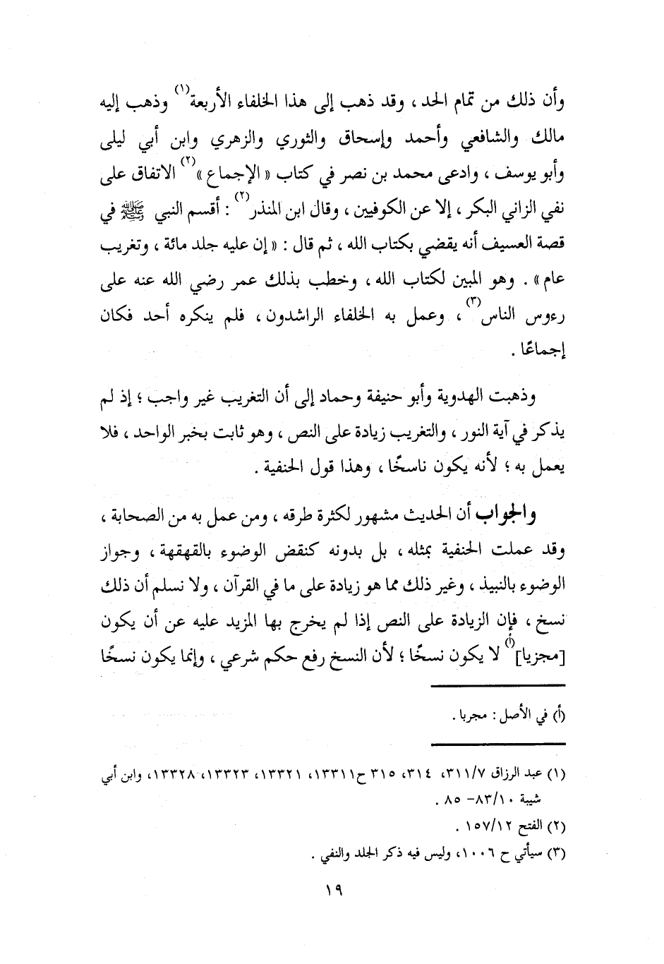 وذهبت الهدوية وأبو حنيفة وحماد إلى أن التغريب غير واجب؛ إذ لم يذكر في آية النور، والتغريب زيادة على النص، وهو ثابت بخبر الواحد، فلا يعمل به، لأنه يكون ناسخًا، وهذا قول الحنفية.