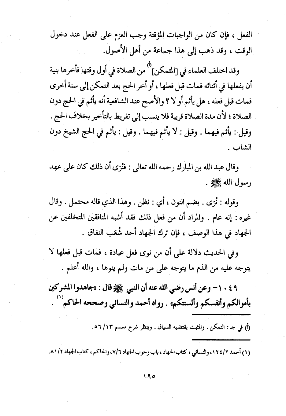 1049 - وعن أنس رضي الله عنه أن النبي - صلى الله عليه وسلم - قال: "جاهدوا المشركين بأموالكم وأنفسكم وألسنتكم". رواه أحمد والنسائي وصححه الحاكم (¬1).