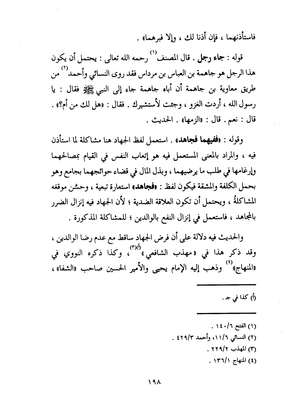 وقوله: "ففيهما فجاهد". استعمل لفظ الجهاد هنا مشاكلة لما استأذن فيه، والمراد بالمعنى المستعمل فيه هو إتعاب النفس في القيام بمصالحهما وإرغامها في طلب ما يرضيهما، وبذل المال في قضاء حوائجهما بجامع وهو يحمل الكلفة والمشقة فيكون لفظ: "فجاهد" استعارة تبعية، وحسَّن موقعَه المشاكلةُ، ويحتمل أن تكون العلاقة الضدية؛ لأن الجهاد فيه إنزال الضرر بالمجاهد، فاستعمل في إنزال النفع بالوالدين؛ للمشاكلة المذكورة.