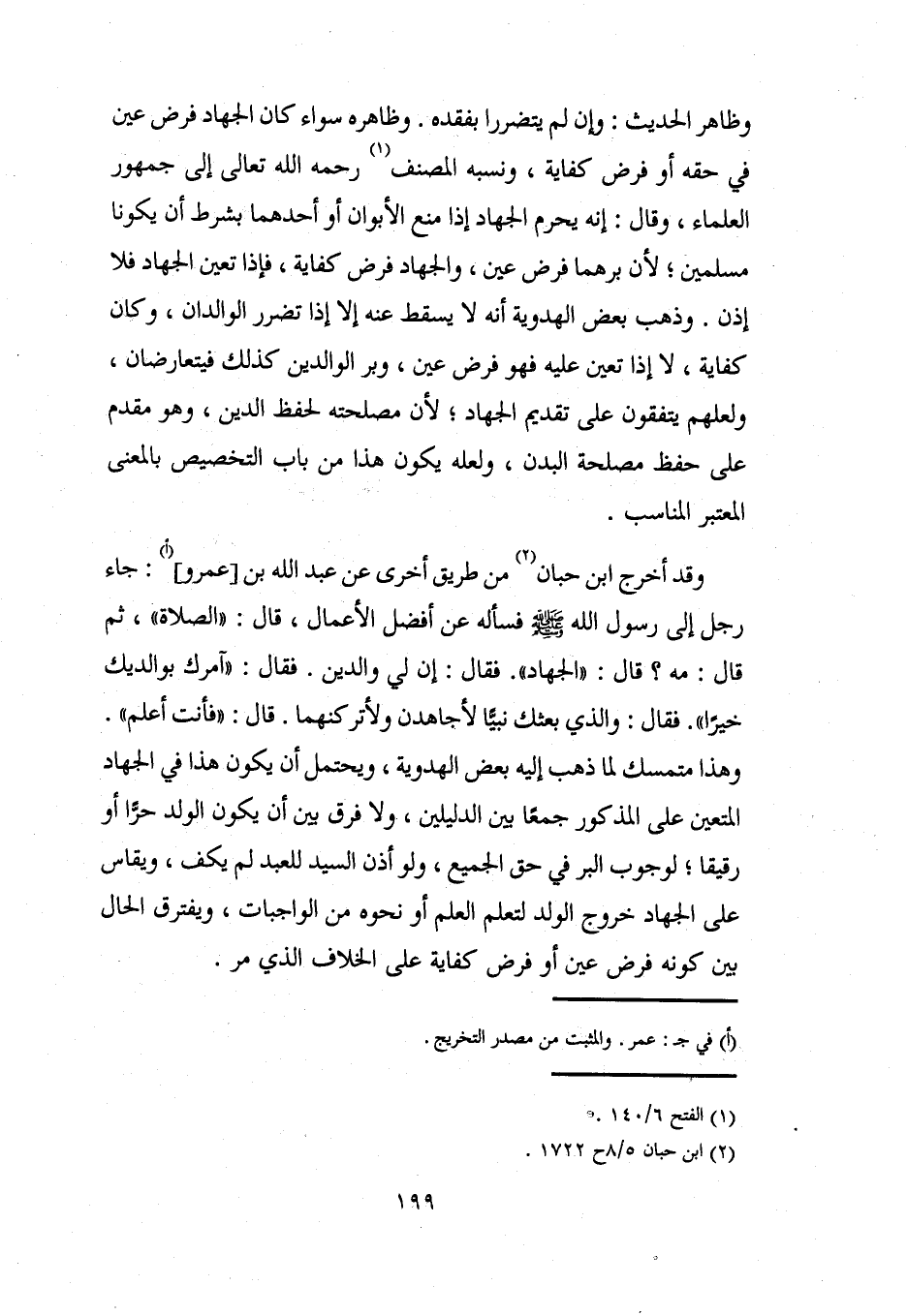 وقد أخرج ابن حبان (¬2) من طريق أخرى عن عبد الله بن [عمرو] (أ): جاء رجل إلى رسول الله - صلى الله عليه وسلم - فسأله عن أفضل الأعمال، قال: "الصلاة"، ثم قال: مه؟ قال: "الجهاد". فقال: إن لي والدين. فقال: "آمرك بوالديك خيرًا". فقال: والذي بعثك نبيًّا لأجاهدن ولأتركنهما. قال: "فأنت أعلم". وهذا متمسك لما ذهب إليه بعض الهدوية، ويحتمل أن يكون هذا في الجهاد المتعين على المذكور جمعًا بين الدليلين، ولا فرق لين أن يكون الولد حرًّا أو رقيقا؛ لوجوب البر في حق الجميع، ولو أذن السيد للعبد لم يكف، ويقاس على الجهاد خروج الولد لتعلم العلم أو نحوه من الواجبات، ويفترق الحال بين كونه فرض عين أو فرض كفاية على الخلاف الذي مر.
