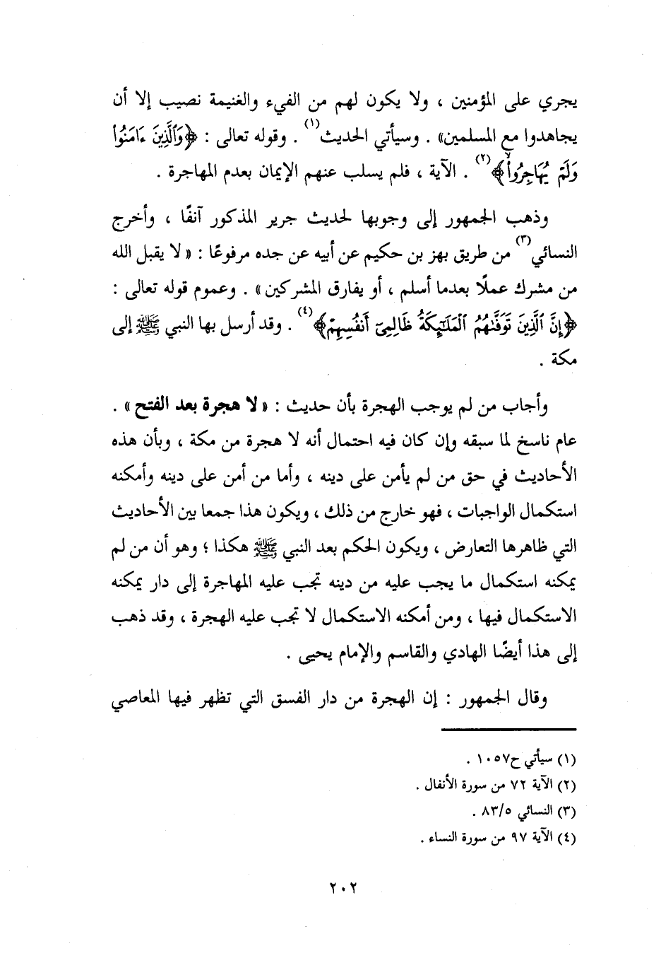 وأجاب من لم يوجب الهجرة بأن حديث: "لا هجرة بعد الفتح". عام ناسخ لما سبقه وإن كان فيه احتمال أنه لا هجرة من مكة، وبأن هذه الأحاديث في حق من لم يأمن على دينه، وأما من أمن على دينه وأمكنه استكمال الواجبات، فهو خارج من ذلك، ويكون هذا جمعا بين الأحاديث التي ظاهرها التعارض، ويكون الحكم بعد النبي - صلى الله عليه وسلم - هكذا؛ وهو أن من لم يمكنه استكمال ما يجب عليه من دينه تجب عليه المهاجرة إلى دار يمكنه الاستكمال فيها، ومن أمكنه الاستكمال لا تجب عليه الهجرة، وقد ذهب إلى هذا أيضًا الهادي والقاسم والإمام يحيى.