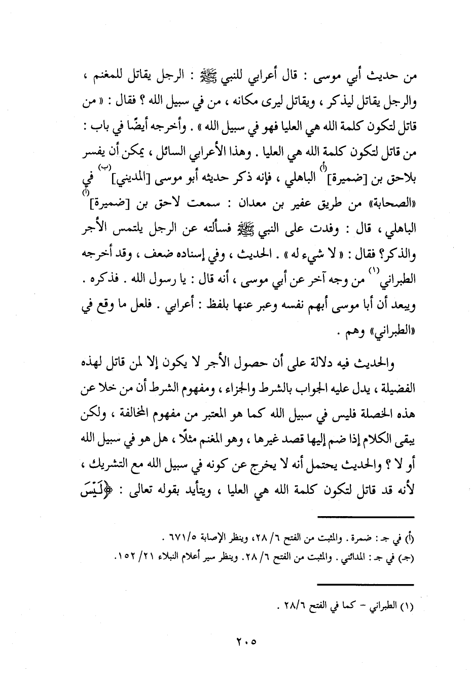 من حديث أبي موسى: قال أعرابي للنبي - صلى الله عليه وسلم -: الرجل يقاتل للمغنم، والرجل يقاتل ليذكر، ويقاتل ليرى مكانه، من في سبيل الله؟ فقال: "من قاتل لتكون كلمة الله هي العليا فهو في سبيل الله". وأخرجه أيضًا في باب: من قاتل لتكون كلمة الله هي العليا. وهذا الأعرابي السائل، يمكن أن يفسر بلاحق بن [ضميرة] (أ) الباهلي، فإنه ذكر حديثه أبو موسى [المديني] في "الصحابة" من طريق عفير بن معدان: سمعت لاحق بن [ضميرة] (أ) الباهلي، قال: وفدت على النبي كيم فسألته عن الرجل يلتمس الأجر والذكر؟ فقال: "لا شيء له". الحديث، وفي إسناده ضعف، وقد أخرجه الطبراني (¬1) من وجه آخر عن أبي موسى، أنه قال: يا رسول الله. فذكره. ويبعد أن أبا موسى أبهم نفسه وعبر عنها بلفظ: أعرابي. فلعل ما وقع في "الطبراني" وهم.
