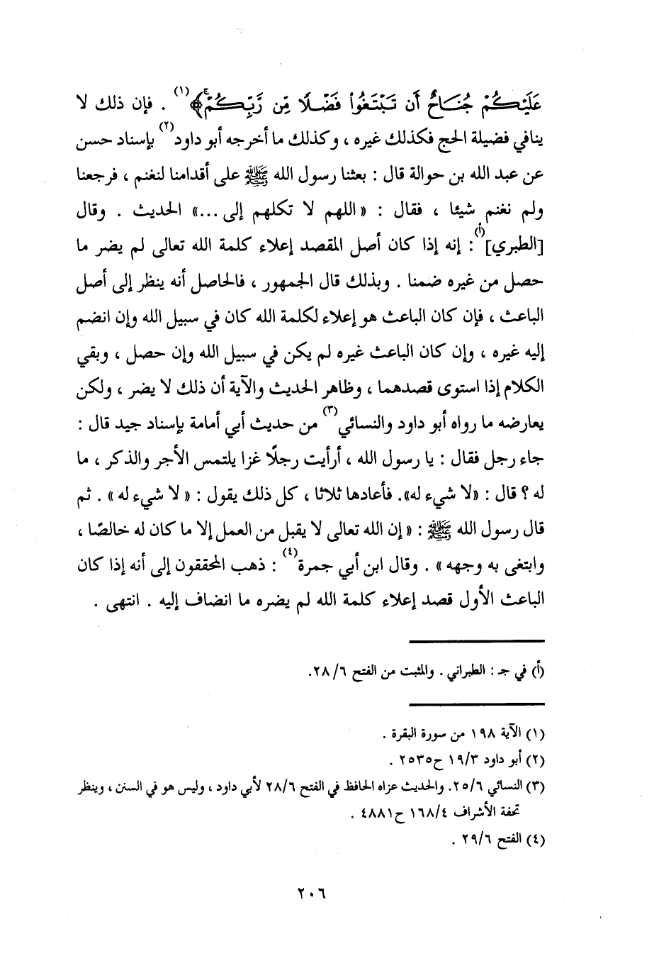 عَلَيْكُمْ جُنَاحٌ أَنْ تَبْتَغُوا فَضْلًا مِنْ رَبِّكُمْ} (¬1). فإن ذلك لا ينافي فضيلة الحج فكذلك غيره، وكذلك ما أخرجه أبو داود (¬2) بإسناد حسن عن عبد الله بن حوالة قال: بعثنا رسول الله - صلى الله عليه وسلم - على أقدامنا لنغنم، فرجعنا ولم نغنم شيئًا، فقال: "اللهم لا تكلهم إلى ... " الحديث. وقال [الطبري] (أ): إنه إذا كان أصل المقصد إعلاء كلمة الله تعالى لم يضر ما حصل من غيره ضمنا. وبذلك قال الجمهور، فالحاصل أنه ينظر إلى أصل الباعث، فإن كان الباعث هو إعلاء لكلمة الله كان في سبيل الله وإن انضم إليه غيره، وإن كان الباعث غيره لم يكن في سبيل الله وإن حصل، وبقي الكلام إذا استوى قصدهما، وظاهر الحديث والآية أن ذلك لا يضر، ولكن يعارضه ما رواه أبو داود والنسائي (¬3) من حديث أبي أمامة بإسناد جيد قال: جاء رجل فقال: يا رسول الله، أرأيت رجلًا غزا يلتمس الأجر والذكر، ما له؟ قال: "لا شيء له". فأعادها ثلاثا، كل ذلك يقول: "لا شيء له". ثم قال رسول الله - صلى الله عليه وسلم -: "إن الله تعالى لا يقبل من العمل إلا ما كان له خالصًا، وابتغى به وجهه". وقال ابن أبي جمرة (¬4): ذهب المحققون إلى أنه إذا كان الباعث الأول قصد إعلاء كلمة الله لم يضره ما انضاف إليه. انتهى.