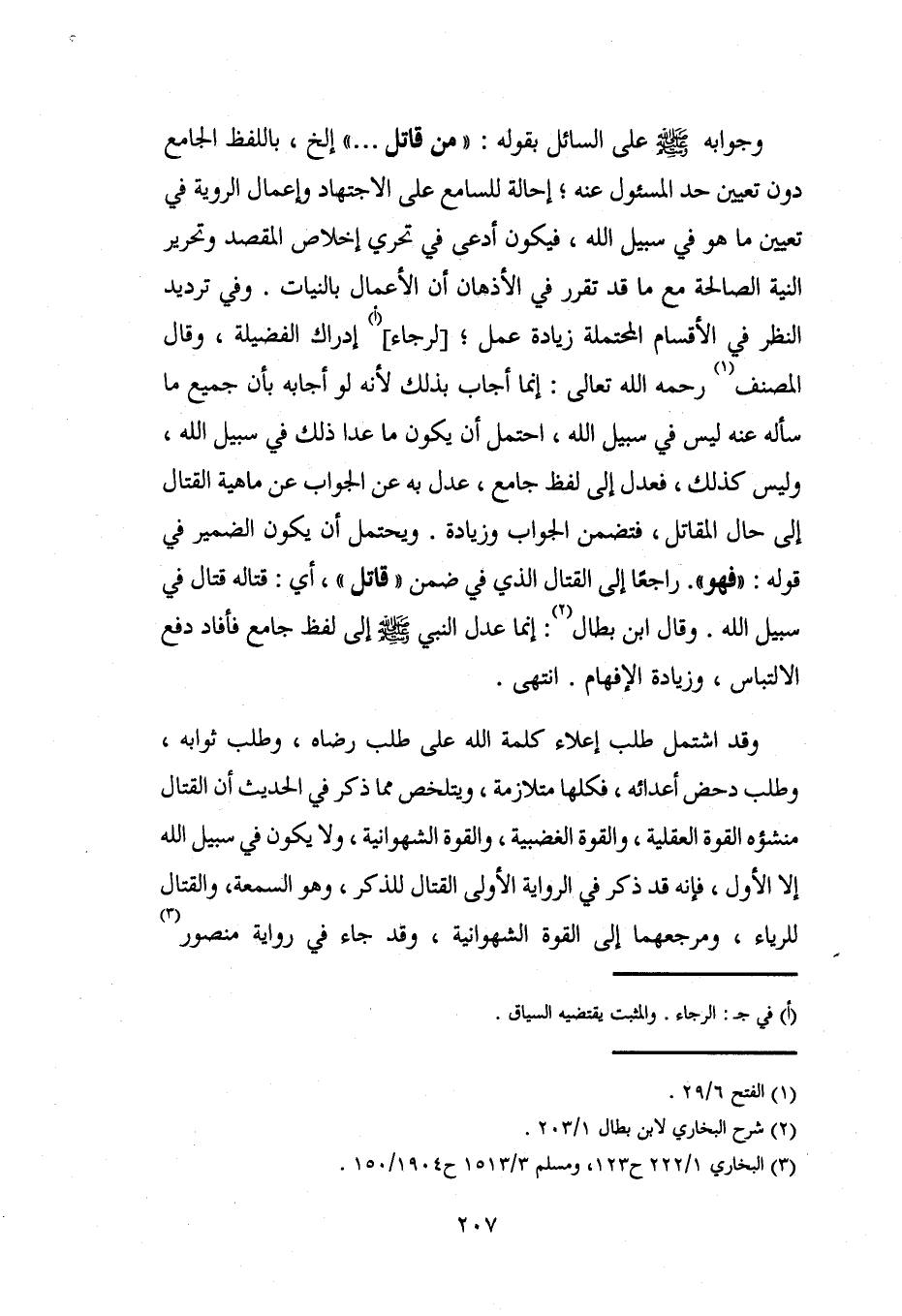 وقد اشتمل طلب إعلاء كلمة الله على طلب رضاه، وطلب ثوابه، وطلب دحض أعدائه، فكلها متلازمة، ويتلخص مما ذكر في الحديث أن القتال منشؤه القوة العقلية، والقوة الغضبية، والقوة الشهوانية، ولا يكون في سبيل الله إلا الأول، فإنه قد ذكر في الرواية الأولى القتال للذكر، وهو السمعة، والقتال للرياء، ومرجعهما إلى القوة الشهوانية، وقد جاء في رواية منصور (¬3)