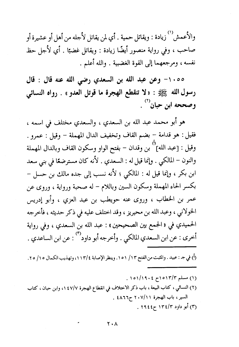 1055 - وعن عبد الله بن السعدي رضي الله عنه قال: قال رسول الله - صلى الله عليه وسلم -: "لا تنقطع الهجرة ما قوتل العدو". رواه النسائي وصححه ابن حبان (¬2).