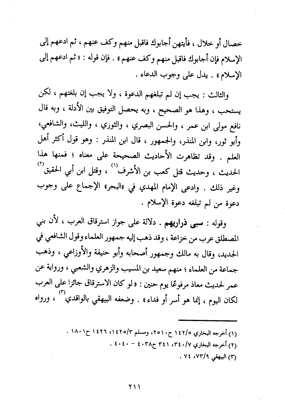 خصال أو خلال، فأيتهن أجابوك فأقبل منهم وكف عنهم، ثم ادعهم إلى الإِسلام فإن أجابوك فاقبل منهم وكف عنهم". فإن قوله: "ثم ادعهم إلى الإِسلام". يدل على وجوب الدعاء.