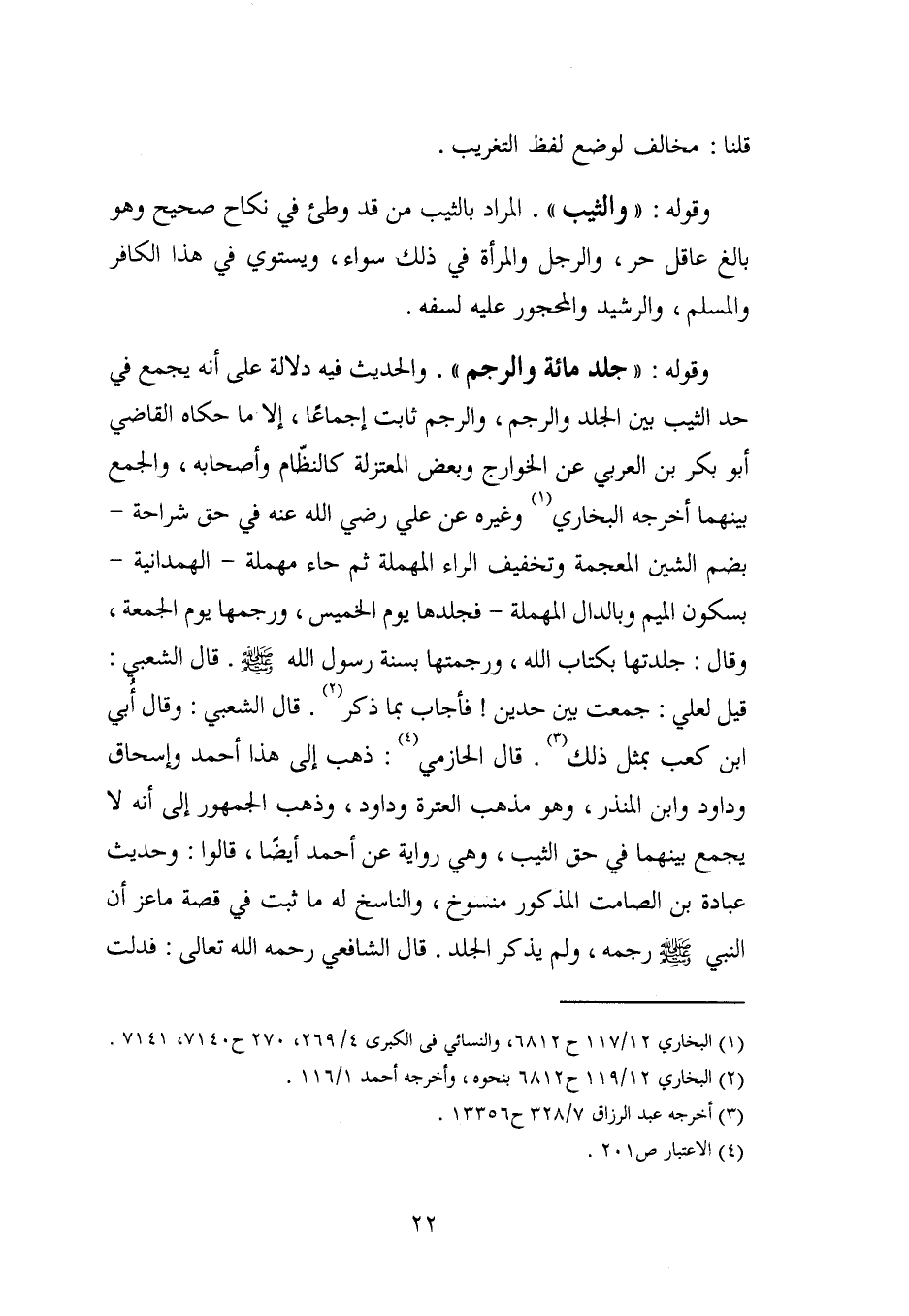 وقوله: "جلد مائة والرجم". والحديث فيه دلالة على أنه يجمع في حد الثيب بين الجلد والرجم، والرجم ثابت إجماعًا، إلا ما حكاه القاضي أبو بكر بن العربي عن الخوارج وبعض المعتزلة كالنظّام وأصحابه، والجمع بينهما أخرجه البخاري (¬1) وغيره عن علي رضي الله عنه في حق شراحة -بضم الشين المعجمة وتخفيف الراء المهملة ثم حاء مهملة- الهمدانية -بسكون الميم وبالدال المهملة- فجلدها يوم الخميس، ورجمها يوم الجمعة، وقال: جلدتها بكتاب الله، ورجمتها بسنة رسول الله - صلى الله عليه وسلم -. قال الشعبي: قيل لعلي: جمعت بين حدين! فأجاب بما ذكر (¬2). قال الشعبي: وقال أبي ابن كعب بمثل ذلك (¬3). قال الحازمي (¬4): ذهب إلى هذا أحمد وإسحاق وداود وابن المنذر، وهو مذهب العترة وداود، وذهب الجمهور إلى أنه لا يجمع بينهما في حق الثيب، وهي رواية عن أحمد أيضًا، قالوا: وحديث عبادة بن الصامت المذكور منسوخ، والناسخ له ما ثبت في قصة ماعز أن النبي - صلى الله عليه وسلم - رجمه، ولم يذكر الجلد. قال الشافعي رحمه الله تعالى: فدلت