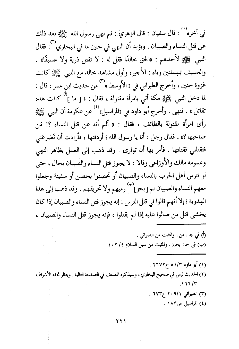 في آخره (¬1): قال سفيان: قال الزهري: ثم نهى رسول الله - صلى الله عليه وسلم - بعد ذلك عن قتل النساء والصبيان. ويؤيد أن النهي في حنين ما في البخاري (¬2): فقال النبي - صلى الله عليه وسلم - لأحدهم: "الحق خالدًا فقل له: لا تقتل ذرية ولا عسيفًا". والعسيف بمهملتين وياء: الأجير، وأول مشاهد خالد مع النبي - صلى الله عليه وسلم - كانت غزوة حنين، وأخرج الطبراني في "الأوسط" (¬3) من حديث ابن عمر، قال: لما دخل النبي - صلى الله عليه وسلم - مكة أتي بامرأة مقتولة، فقال: " [ما] (أ) كانت هذه تقاتل". فنهى. وأخرج أبو داود في "المراسيل" (¬4) عن عكرمة أن النبي - صلى الله عليه وسلم - رأى امرأة مقتولة بالطائف، فقال: "ألم أنه عن قتل النساء؟! مَن صاحبها؟ ". فقال رجل: أنا يا رسول الله؛ أردفتها، فأرادت أن تَصْرعَني فتقتلني فقتلتها. فأمر بها أن توارى. وقد ذهب إلى العمل بظاهر النهي وعمومه مالك والأوزاعي وقالا: لا يجوز قتل النساء والصبيان بحال، حتى لو تترس أهل الحرب بالنساء والصبيان أو تحصنوا بحصن أو سفينة وجعلوا معهم النساء والصبيان لم [يجز] (ب) رميهم ولا تحريقهم. وقد ذهب إلى هذا الهدوية؛ إلا أنهم قالوا في قتل الترس: إنه يجوز قتل النساء والصبيان إذا كان يخشى قتل من صالوا عليه إذا لم يقتلوا، فإنه يجوز قتل النساء والصبيان،