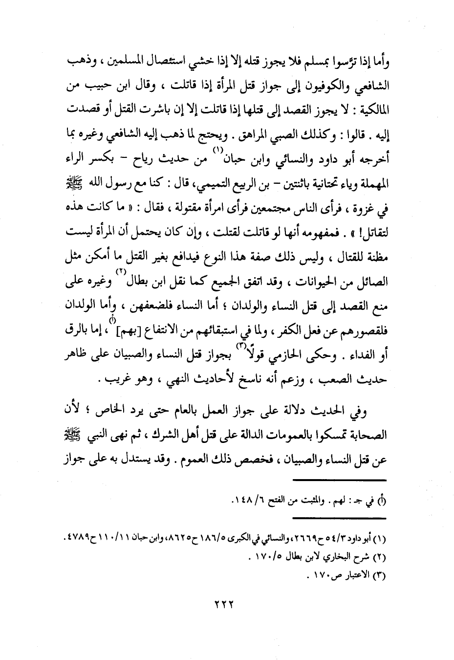وأما إذا ترَّسوا بمسلم فلا يجوز قتله إلا إذا خشي استئصال المسلمين، وذهب الشافعي والكوفيون إلى جواز قتل المرأة إذا قاتلت، وقال ابن حبيب من المالكية: لا يجوز القصد إلى قتلها إذا قاتلت إلا إن باشرت القتل أو قصدت إليه. قالوا: وكذلك الصبي المراهق. ويحتج لما ذهب إليه الشافعي وغيره بما أخرجه أبو داود والنسائي وابن حبان (¬1) من حديث رياح -بكسر الراء المهملة وياء تحتانية باثنتين- بن الربيع التميمي، قال: كنا مع رسول الله - صلى الله عليه وسلم - في غزوة، فرأى الناس مجتمعين فرأى امرأة مقتولة، فقال: "ما كانت هذه لتقاتل! ". فمفهومه أنها لو قاتلت لقتلت، وءان كان يحتمل أن المرأة ليست مظنة للقتال، وليس ذلك صفة هذا النوع فيدافع بغير القتل ما أمكن مثل الصائل من الحيوانات، وقد اتفق الجميع كما نقل ابن بطال (¬2) وغيره على منع القصد إلى قتل النساء والولدان؛ أما النساء فلضعفهن، وأما الولدان فلقصورهم عن فعل الكفر، ولما في استبقائهم من الانتفاع [بهم] (أ)، إما بالرق أو الفداء. وحكى الحازمي قولًا (¬3) بجواز قتل النساء والصبيان على ظاهر حديث الصعب، وزعم أنه ناسخ لأحاديث النهي، وهو غريب.