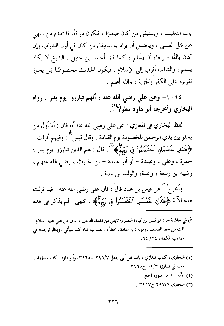 1064 - وعن علي رضي الله عنه، أنهم تبارزوا يوم بدر. رواه البخاري وأخرجه أبو داود مطولًا (¬1).