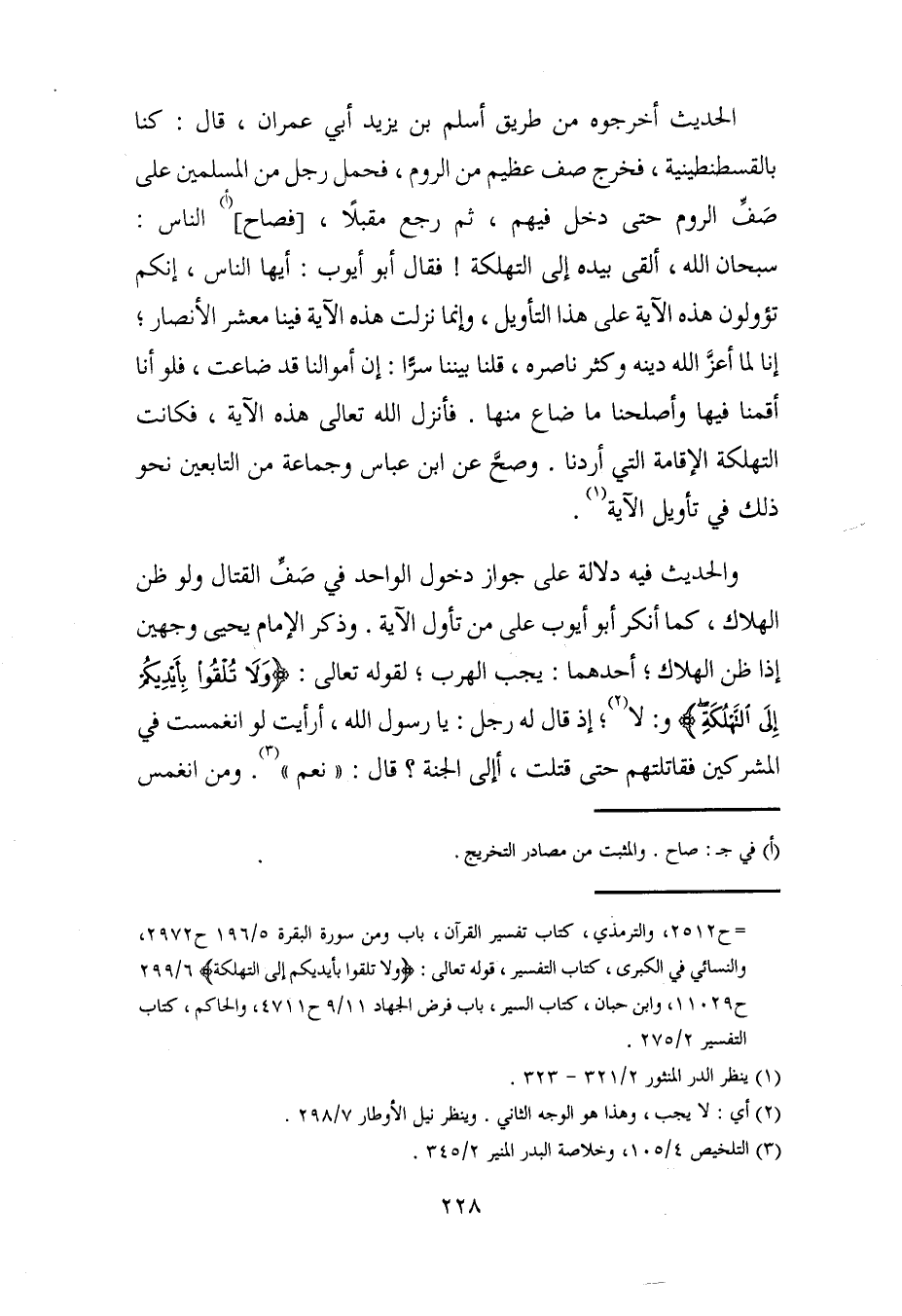 = ح 2512، والترمذي، كتاب تفسير القرآن، باب ومن سورة البقرة 5/ 196 ح 2972، والنسائي في الكبرى، كتاب التفسير, قوله تعالى: {وَلَا تُلْقُوا بِأَيْدِيكُمْ إِلَى التَّهْلُكَةِ} 6/ 299 ح 11029، وابن حبان، كتاب السير، باب فرض الجهاد 11/ 9 ح 4711، والحاكم، كتاب التفسير 2/ 275.