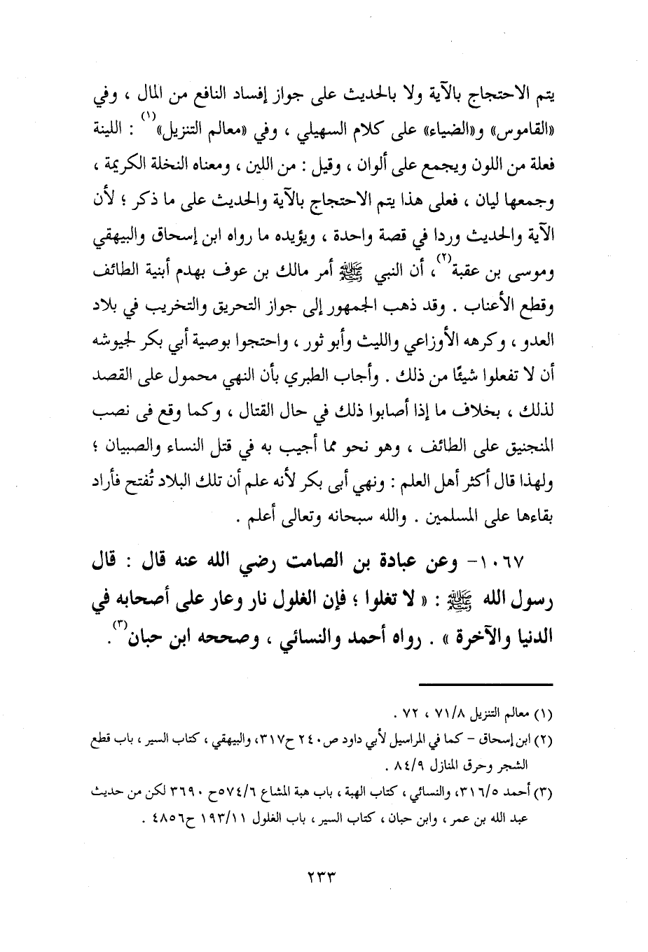 1067 - وعن عبادة بن الصامت رضي الله عنه قال: قال رسول الله - صلى الله عليه وسلم -: "لا تغلوا؛ فإن الغلول نار وعار على أصحابه في الدنيا والآخرة". رواه أحمد والنسائي، وصححه ابن حبان (¬3).