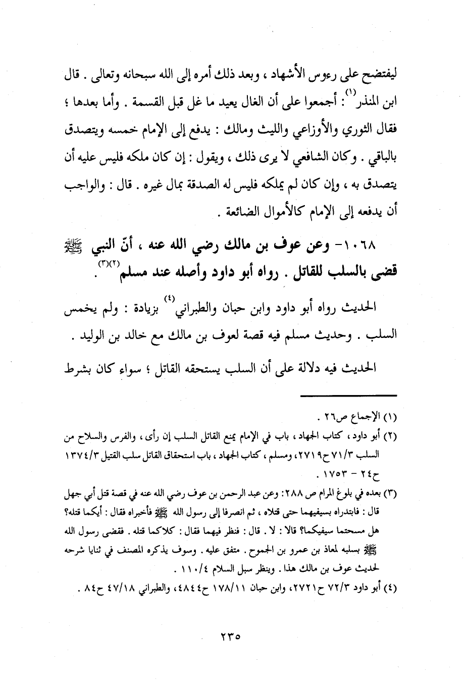 1068 - وعن عوف بن مالك رضي الله عنه، أنّ النبي - صلى الله عليه وسلم - قضى بالسلب للقاتل. رواه أبو داود وأصله عند مسلم (¬2) (¬3).