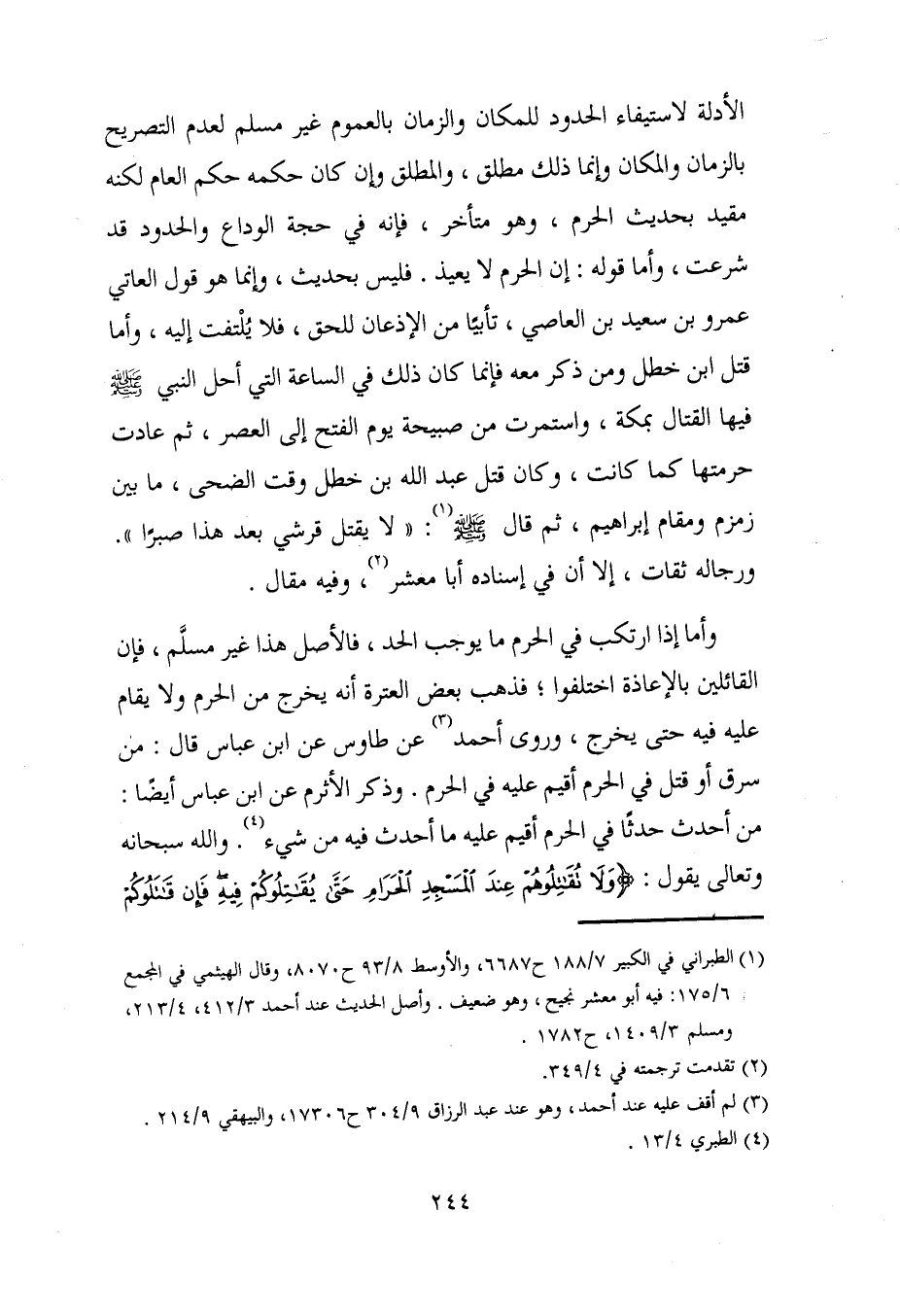 وأما إذا ارتكب في الحرم ما يوجب الحد، فالأصل هذا غير مسلَّم، فإن القائلين بالإعاذة اختلفوا؛ فذهب بعض العترة أنه يخرج من الحرم ولا يقام عليه فيه حتى يخرج، وروى أحمد (¬3) عن طاوس عن ابن عباس قال: من سرق أو قتل في الحرم أقيم عليه في الحرم. وذكر الأثرم عن ابن عباس أيضًا: من أحدث حدثًا في الحرم أقيم عليه ما أحدث فيه من شيء (¬4). والله سبحانه وتعالى يقول: {وَلَا تُقَاتِلُوهُمْ عِنْدَ الْمَسْجِدِ الْحَرَامِ حَتَّى يُقَاتِلُوكُمْ فِيهِ فَإِنْ قَاتَلُوكُمْ