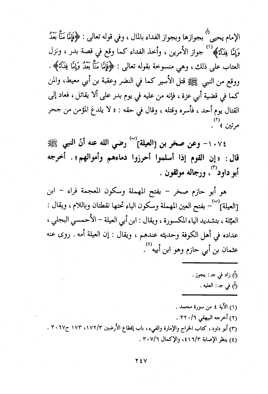 1074 - وعن صخر بن [العيلة] (ب) رضي الله عنه أنّ النبي - صلى الله عليه وسلم - قال: "إن القوم إذا أسلموا أحرزوا دماءهم وأموالهم". أخرجه أبو داود (¬3)، ورجاله موثقون.