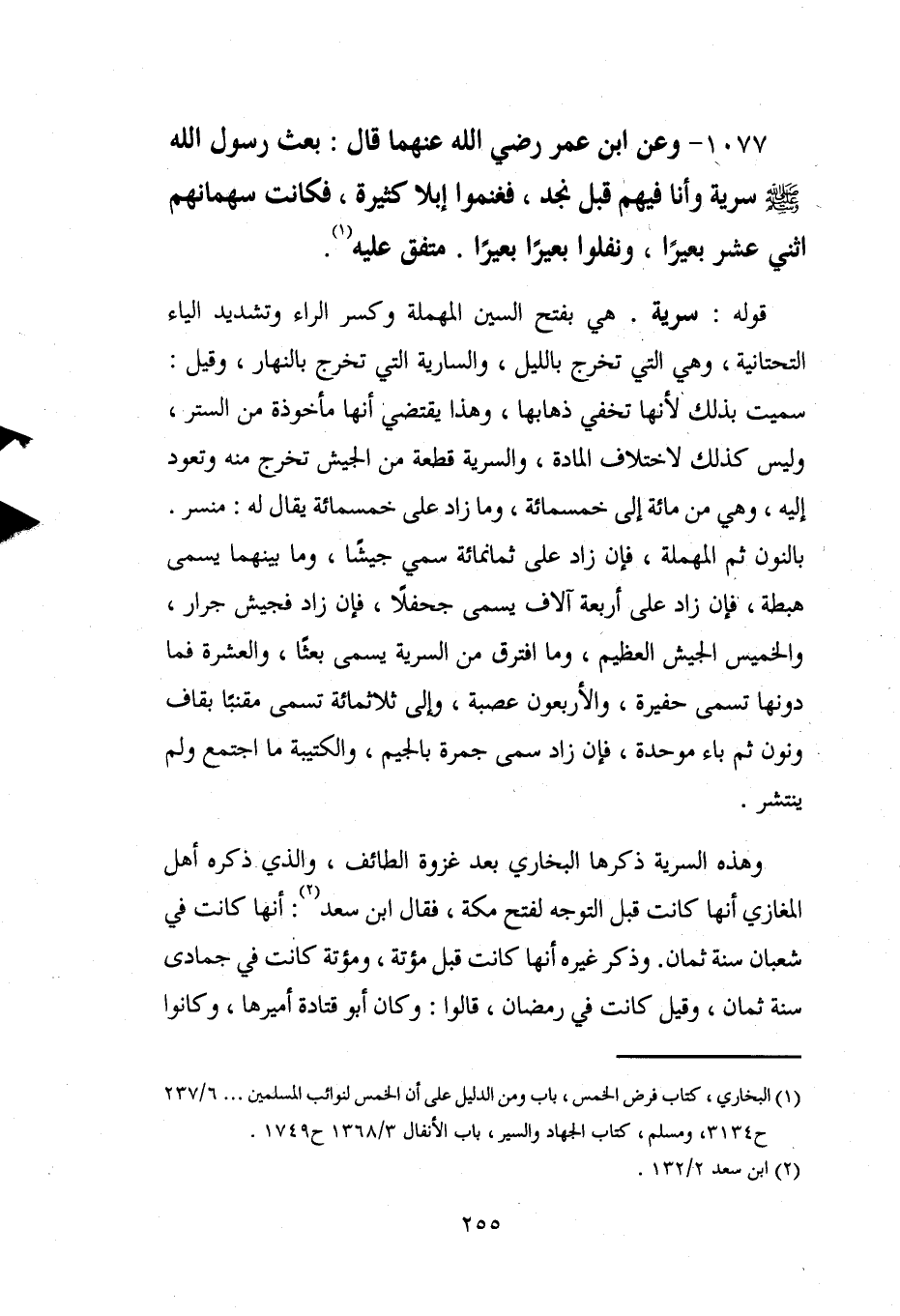1077 - وعن ابن عمر رضي الله عنهما قال: بعث رسول الله - صلى الله عليه وسلم - سرية وأنا فيهم قبل نجد، فغنموا إبلا كثيرة، فكانت سهمانهم اثني عشر بعيرًا، ونفلوا بعيرًا بعيرًا. متفق عليه (¬1).