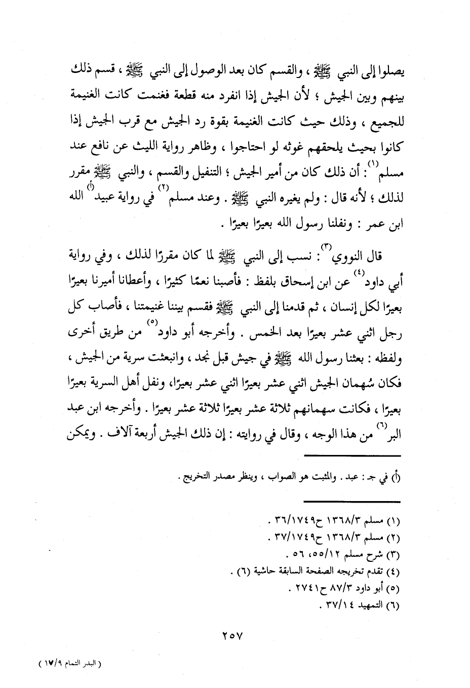 يصلوا إلى النبي - صلى الله عليه وسلم -، والقسم كان بعد الوصول إلى النبي - صلى الله عليه وسلم -، قسم ذلك بينهم وبين الجيش؛ لأن الجيش إذا انفرد منه قطعة فغنمت كانت الغنيمة للجميع، وذلك حيث كانت الغنيمة بقوة رد الجيش مع قرب الجيش إذا كانوا بحيث يلحقهم غوثه لو احتاجوا، وظاهر رواية الليث عن نافع عند مسلم (¬1): أن ذلك كان من أمير الجيش؛ التنفيل والقسم، والنبي - صلى الله عليه وسلم - مقرر لذلك؛ لأنه قال: ولم يغيره النبي - صلى الله عليه وسلم -. وعند مسلم (¬2) في رواية عبيد (أ) الله بن عمر: ونفلنا رسول الله بعيرًا بعيرًا.