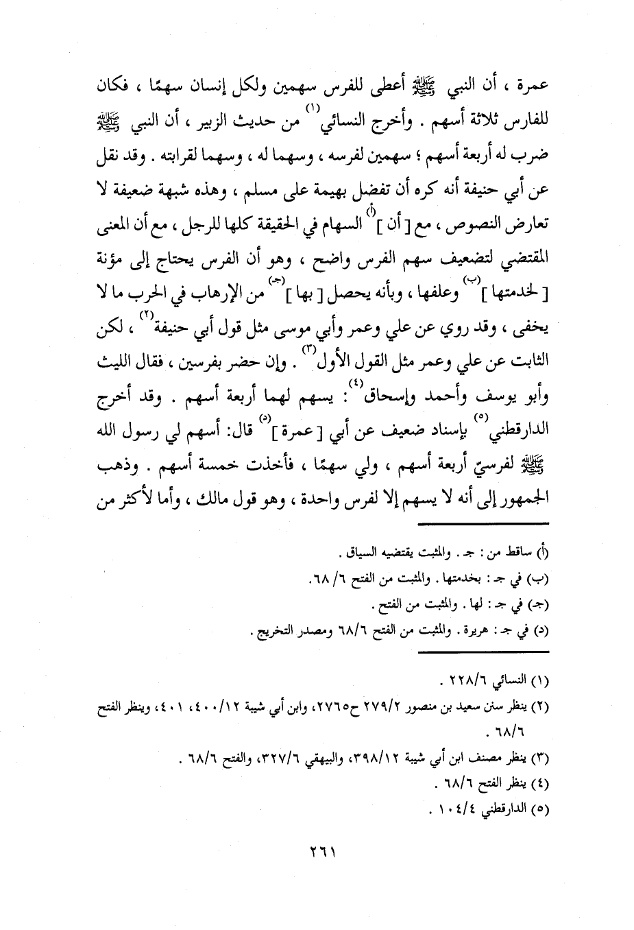 عمرة، أن النبي - صلى الله عليه وسلم - أعطى للفرس سهمين ولكل إنسان سهمًا، فكان للفارس ثلاثة أسهم. وأخرج النسائي (¬1) من حديث الزبير، أن النبي - صلى الله عليه وسلم - ضرب له أربعة أسهم؛ سهمين لفرسه، وسهما له، وسهما لقرابته. وقد نقل عن أبي حنيفة أنه كره أن تفضل بهيمة على مسلم، وهذه شبهة ضعيفة لا تعارض النصوص، مع [أن] (أ) السهام في الحقيقة كلها للرجل، مع أن المعنى المقتضي لتضعيف سهم الفرس واضح، وهو أن الفرس يحتاج إلى مؤنة [لخدمتها] (ب) وعلفها، وبأنه يحصل [بها] (جـ) من الإرهاب في الحرب ما لا يخفى، وقد روي عن علي وعمر وأبي موسى مثل قول أبي حنيفة (¬2)، لكن الثابت عن علي وعمر مثل القول الأول (¬3). وإن حضر بفرسين، فقال الليث وأبو يوسف وأحمد وإسحاق (¬4): يسهم لهما أربعة أسهم. وقد أخرج الدارقطني (¬5) بإسناد ضعيف عن أبي [عمرة] (د) قال: أسهم لي رسول الله - صلى الله عليه وسلم - لفرسيّ أربعة أسهم، ولي سهمًا، فأخذت خمسة أسهم. وذهب الجمهور إلى أنه لا يسهم إلا لفرس واحدة، وهو قول مالك، وأما لأكثر من